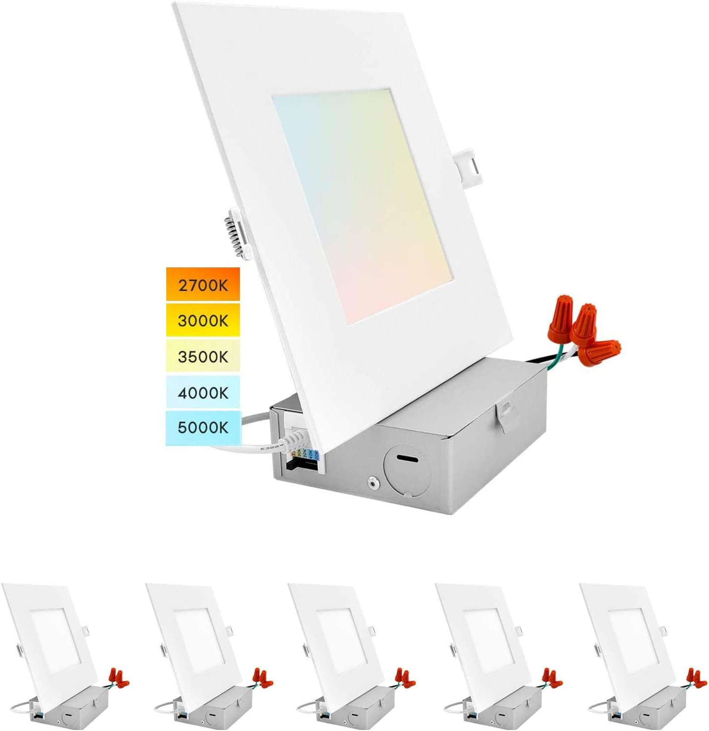 Features:1. 5 Color Temperature Selectable2. 5%-100% Dimmable Brightness3. Come with Junction Box4. 160° Wide Beam Angle5. Ultra-Thin Canless Design6. IC-Rated Thermally Protected7. Compatible with Most Dimmers 8. Saving 90% energyDescription:1. Wattage: 9W2. 900LM High Brightness3. No flicker and noise4. Anti-glare and Scratch-resistant5. No Can Type- Light in Weight and Easy in Installation 6. 6 CCT Adjustable: 2700K, 3000K, 3500K, 4000K, 5000K7. Voltage: AC 110-130V8. Operating Temperature: 14℉ to 104℉9.Surface size: 4.72 inches(120cm)10. Back hole size: 4.13 inches(105cm)