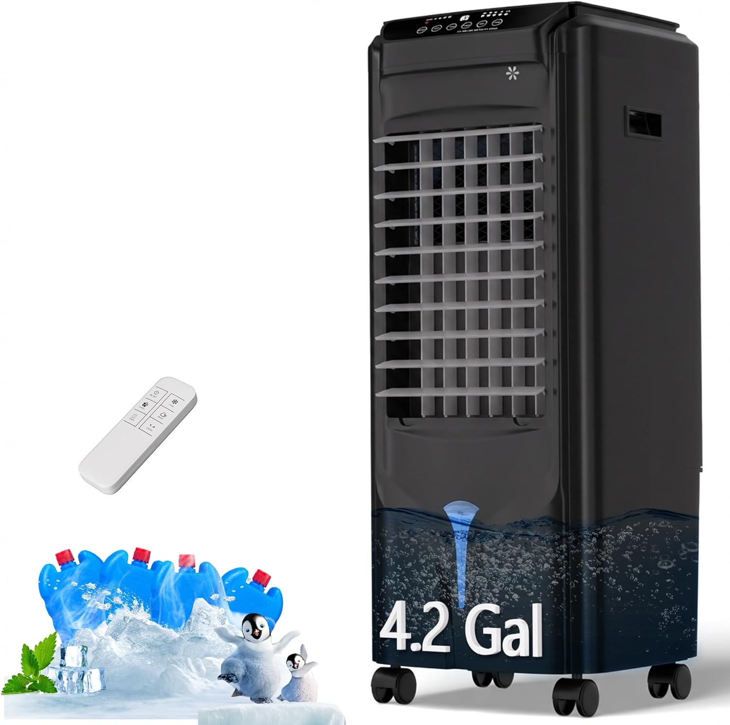 | Additional Features | Swamp Cooler with 4.2-Gal Large Water Tank, 3-IN-1 Windowless Portable Air Conditioner with Adjustable 3-Speeds & 3-Modes, Remote & Touch Control, 120° Wide Oscillation, 12H Timer, Built-in Carrying Handle, Adjustable Shutter, 4*360° Wheels, 4 Ice Boxes, LED Light Control, Digital Display, Evaporative Air Cooler, portable ac unit |