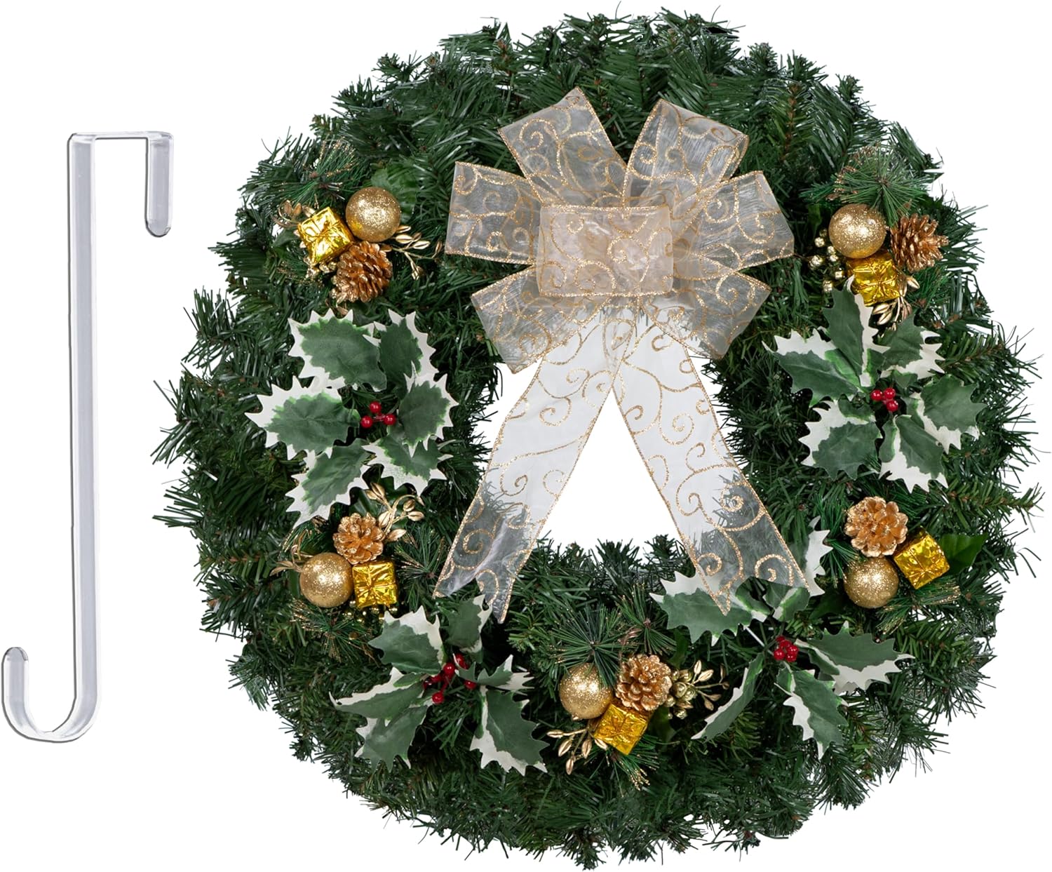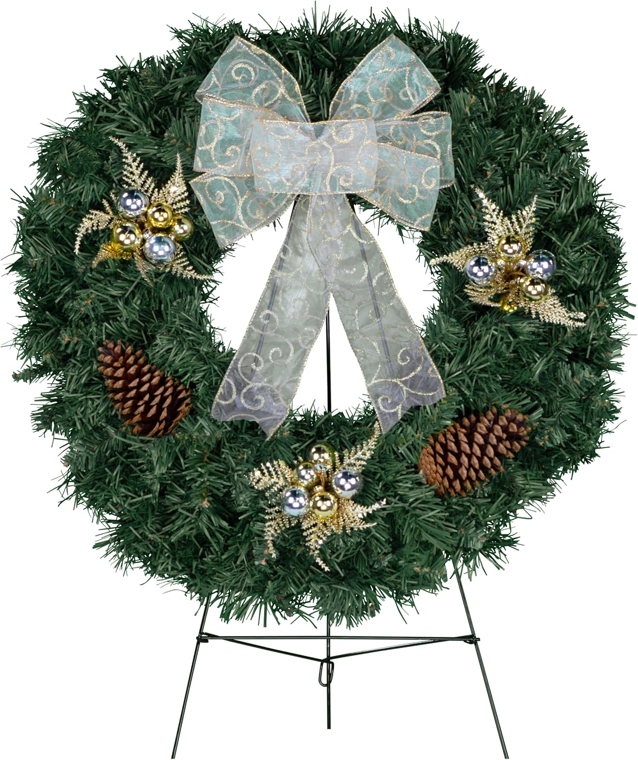 Celebrate the season with this beautiful artificial Christmas wreath featuring Blue Decorations with White Poinsettia and Silver Bow with 7 loops and 2 tails. Each wreath is hand-decorated by our floral designers and arrives ready to display with a green metal easel (28 inches tall).