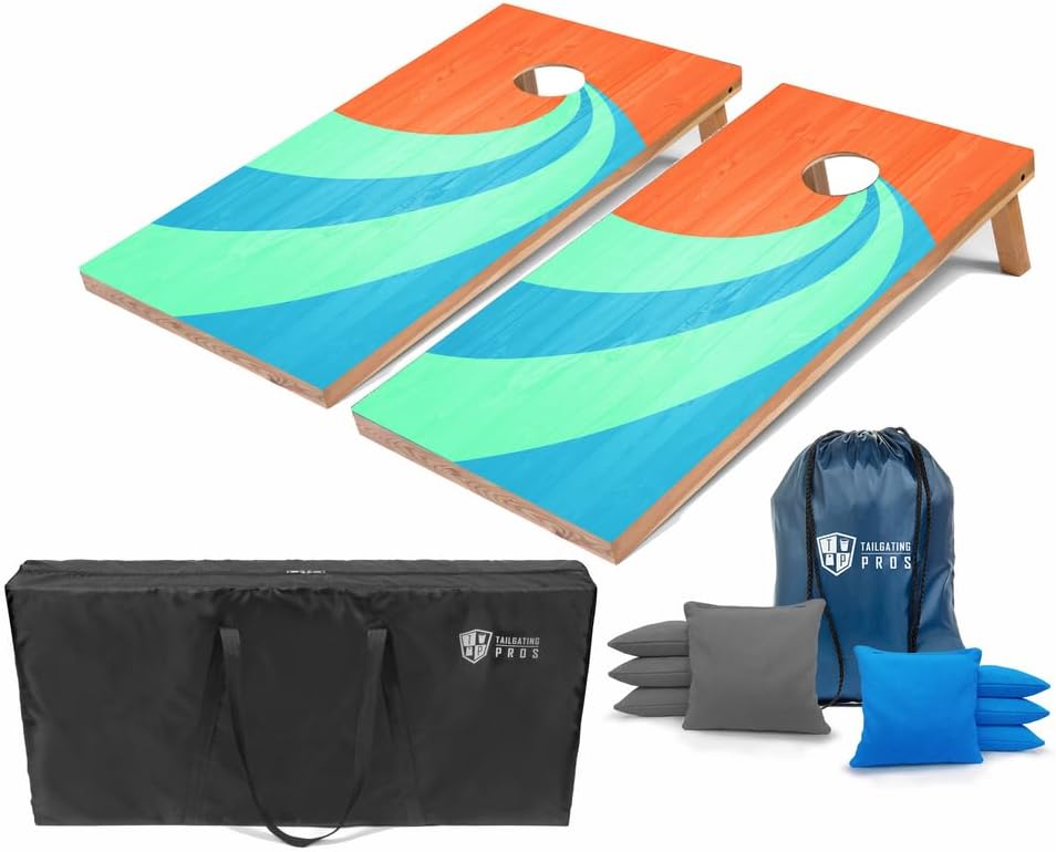 Tailgating Pros Cornhole Set w/ Bean Bags Includes - Two Regulation Size (4ftx2ft) wooden cornhole boards and 8 regulation size cornfilled cornhole bags. The Regulation Size boards measure the classic 4ft x 2ft, meeting Standards, and have a back cross bar to prevent bouncing of the board. Our Cornhole Boards have an advanced design allowing them to weigh only 13 - 15lbs each. The boards have a 1/2” Top Board and are held together with Mitered Joints, Heavy-duty Hardware, and are equipped with Folding Legs. The total set weighs between 34-38lbs, making them easy to transport, compared to a typical set that weighs upwards of 60 lbs. Our Carrying Case is made of High Quality Polyester which offers Convenience and Protection. Use anywhere - Great for tailgates, barbeques, parties, weddings or just backyard fun and are sure to provide hours of entertainment for the whole family.