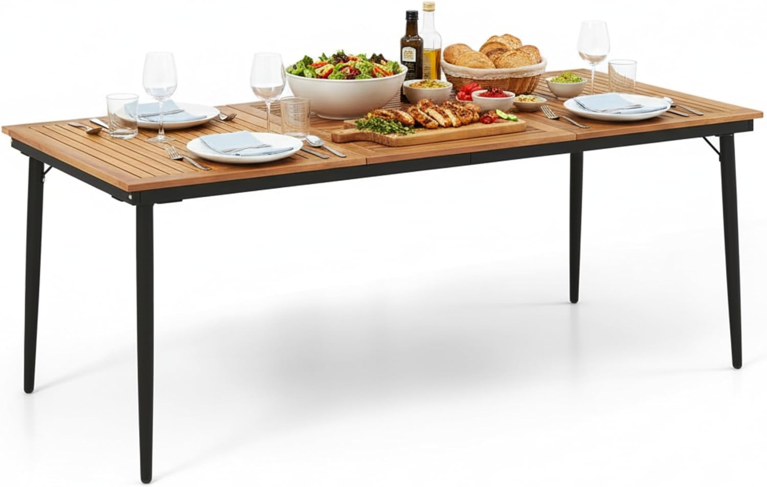 Tangkula 79" Acacia Wood Outdoor Dining Table for 8, Patio Table with Umbrella Hole, Metal Legs & Adjustable Foot Pads, Rectangular 8-Person Outside Table for Garden, Poolside & Backyard