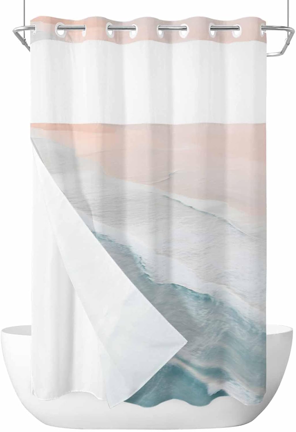 Top Sheer Window Design and Removable Snap On or Off Liner There is a sheer window design at the top of the shower curtain that allows light to enter, providing ample light while maintaining privacy and allowing air circulation to ensure breathability. Sheer window design create a wonderful shower scene, allowing your thoughts to enter nature and giving you a special shower experience. The shower curtain liner adopts a four fold buckle splicing method, which is easy to disassemble. No hook Shower Curtain This washable shower curtain liner features a unique split ring design that makes it easier to hang, eliminating the need to purchase hooks or remove shower curtain rods. Shower curtain with liner can be easily installed in just a few seconds. Innovative design makes life convenient, simple and beautiful. Decoration The shower curtain can be paired with any style and decoration, creating a wonderful scene in your bathing space. It can be used as indoor and outdoor decoration, bringing you a wonderful shower experience. Easy Care The modern shower curtain and detachable lining can be cleaned by machine or hand to maintain cleanliness. The gentle mode is cold water cleaning, non bleachable, and can be ironed at low temperatures. Note If you have any questions about this product, please leave us a message and we will reply to you within 24 hours.