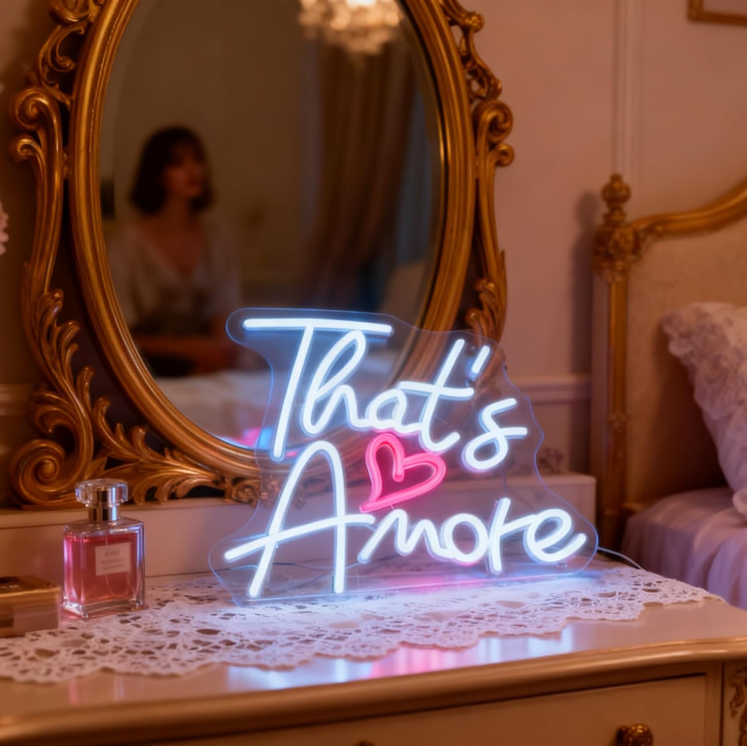 Package includes: This romantic neon sign features the phrase “That's Amore”, paired with a vibrant pink heart accent. It fits perfectly on bedroom walls, dining shelves, or accent tables. The gentle glow adds a cozy, affectionate touch, making it a standout romantic-themed decorative neon light.