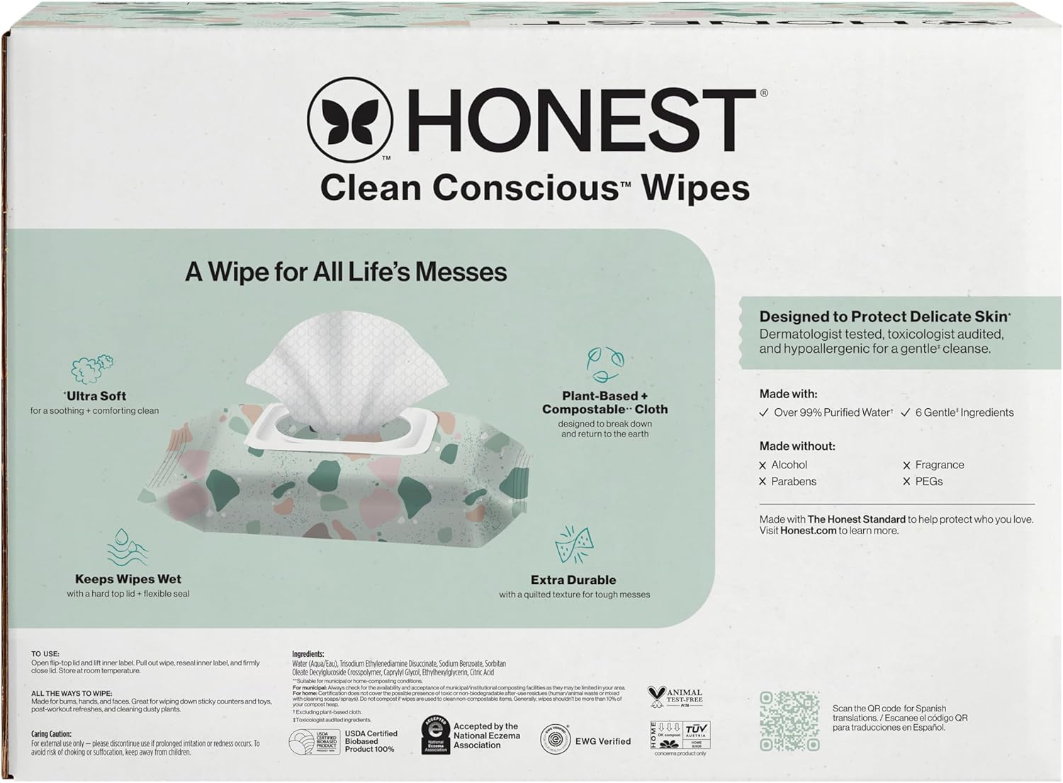 Clean up all of life’s messes with our compostable plant-based baby wipes, made with over 99% water and gentle on sensitive skin. From diaper change duty and messy fingers to sticky counters and gunked-up toys — our ultra-durable, extra thick wipes get the job done! These hypoallergenic plant-based wipes are dermatologist-tested and are made with only 7 transparent ingredients that are toxicologist-audited, making them safe + gentle for baby and the whole family. Wipes made without plastic, fragrances, parabens, and chlorine processing – containing everything you need and nothing you don’t. Now Compostable! Honest Baby Wipes disintegrate in 8 weeks.** For municipal: Always check for the availability and acceptance of municipal/institutional composting facilities as they may be limited in your area. For home: Do not compost if wipes are used to clean non-compostable items like human/animal waste or mixed with cleaning soaps/sprays. Generally, wipes shouldn't be more than 10% of your compost heap. **Following Modified ISO 20200 standards to assess disintegration under home composting conditions.