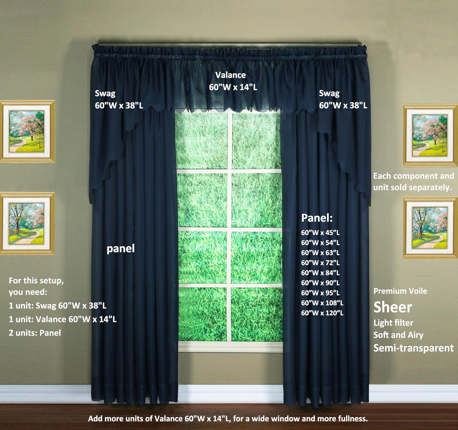 True premium voile sheer, woven by high twisted double filaments, crispy and soft, a true luxury voile sheer, offering authentic touch of French tergal. Interchangeable components, creative combinations, all are easy to create your own window décor in a customized fashion, pick and add to your any window size and style, you take control of your every window fashion style, from 19 sizes in 18 colors! Use 1.5” rod pocket. 100% polyester. Easy care, machine washable. Each unit sold separately. Emelia Top Treatments: Available in valance, swag 38”, swagger 63”, fan insert, double layered ascot, scarf 144” or scarf 216”. Combine and create your top treatment, add more units to fit any wider window! Emelia Tier Curtains: available Tier 24”, Tier 30”, Tier 36”, all tailored in 3" generous ham bottom, full width 60” for each tier pair, also work with swag 38” and valance for all kitchen windows. Emelia Panel Curtains: Direct woven sides on each panel, clean and straight sides, no stiches on both vertical sides of panel! Full width of 60" panel! Generous 5" tailored ham bottom! Panel length available in 45",54”,63”,72”,84”,90”,95”,108”, 120", all length available in 18 colors! Each unit sold separately.