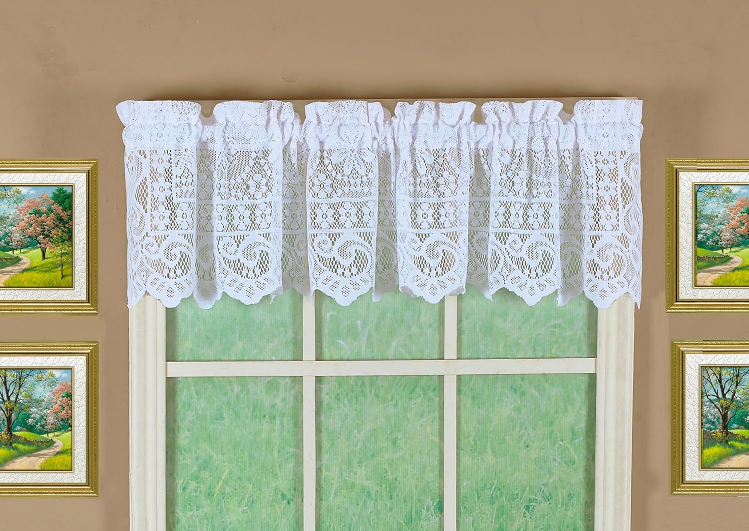 Premium jacquard lace, heavy weight and made of lofted yarn, providing privacy and sunlight filter, entire whole piece engineered with scalloped bottoms and sides. Soft hand and naturally self-drape, the look of Old World. Valance can go with swag. Available in valance, tier 24”, tier 36” and swag 38”. Panels are available in length of 63”, 72”,84”. Available in balloon shade, including clip kit. Swag and valance can work with tiers and panels. Choose colors in cream or white. 1.5” rod pocket. 100% polyester. Easy care, machine washable. Each unit sold separately.