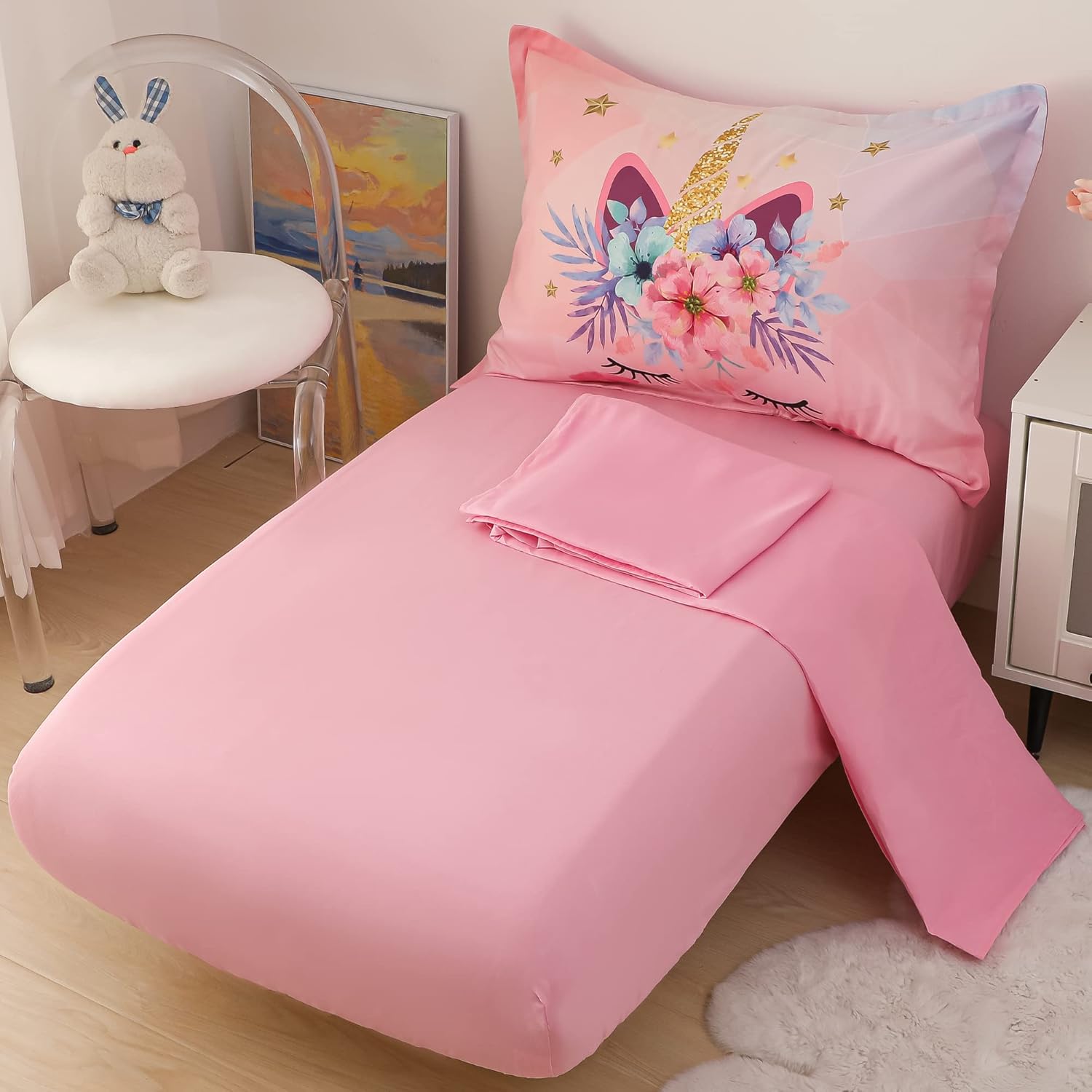 | Included Components | 1 * Envelope Pillow Sham, 1 * Pink Bed Skirt, 1 * Pink Fitted Sheet, 1 * Pink Unicorn Toddler Comforter |
