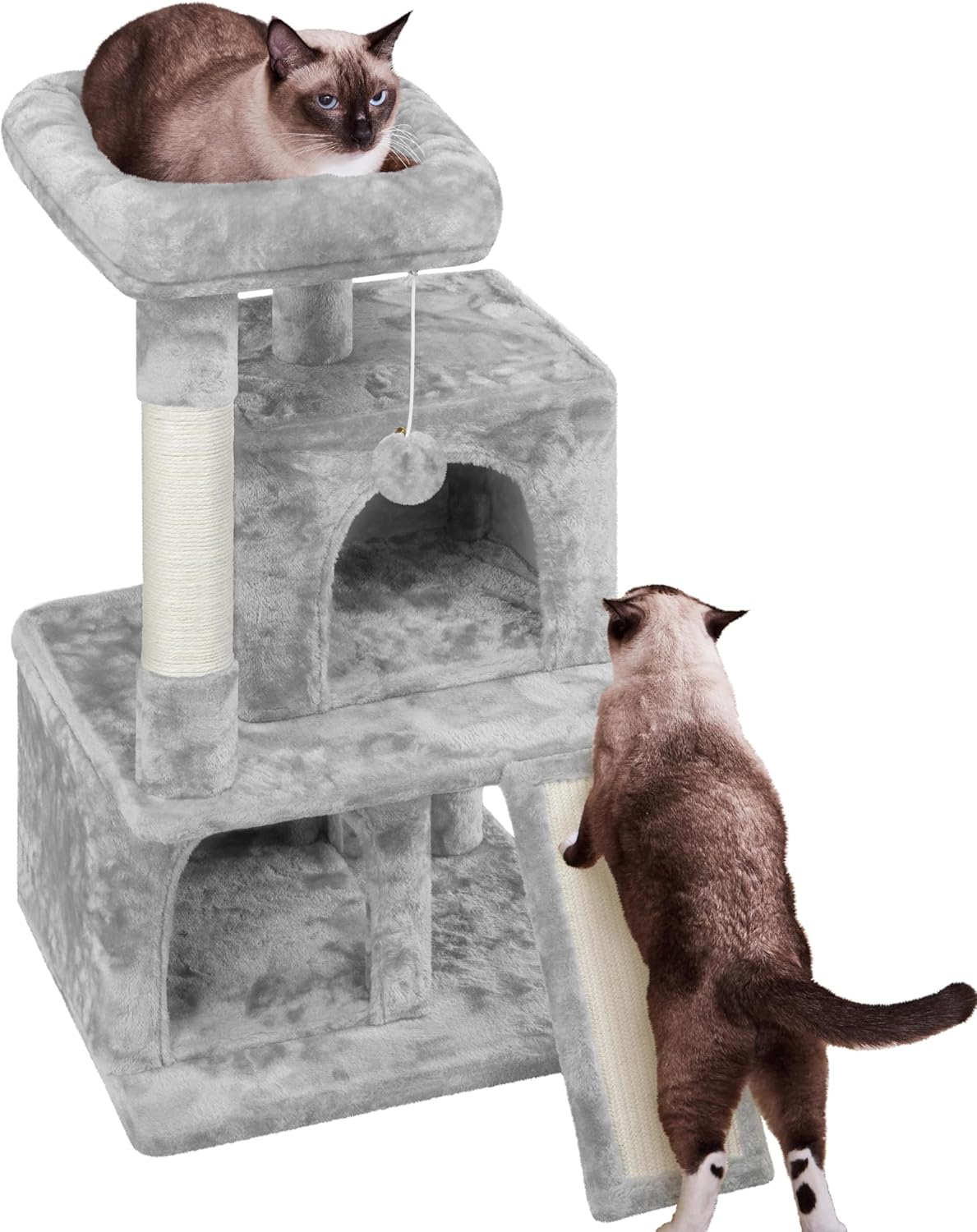Cat Tree Multilevel Cat Tower with Double Condos Cat House Perches Scratching Posts Sisal Rope Furry Ball for Cats KittensQuick overview:If you are a cat owner, this multi-level plush cat tree can not be missed. It is a good playground and comfortable bed for your furry friends. There is a higher perch with raised cushion edges for feline friends to rest and lounge. Plush cover and cushion edges, they will enjoy that perch very much. The dual condos create a sense of security, a good quiet place for them to snooze/sleep. Each condo has two doors, convenient for them to come and go. Three fully-wrapped scratching posts and board are designed for your furry pals to play and exercise their paws. And also, the scratching posts help protect your furniture from cats’ scratches. Durable particleboard, metal and natural sisal ropes and cozy plush, selected materials make sure that our luxury cat house has a long-time service life.Specifications:Color: BeigeMaterial: Particleboard, Plush, Sisal Rope, Metal, Paper Tube, and PlasticOverall size: 49 x 45.5 x 91cm/19.3 x 18 x 36inch (L x W x H)Edged perch: 47 x 39.5 x 9cm/18.5 x 15.6 x 3.5inch (L x W x Thickness)Condo size (ea.): 35 x 30 x 30.5cm/14 x 12 x 12inch (L x W x H)Door size: 18 x 23cm/7 x 9inch (L x H)Scratching board size: 39 x 15.5 x 1.7cm/15.4 x 6 x 0.7inch (L x W x Thickness)Scratching post length: 50cm/19.7inch ; 30cm/12inchBottom board size: 49 x 45.5 x 1.3cm/19.3 x 18 x 0.5inch (L x W x Thickness)N. W.: 11.1kg/24.5lbG. W.: 12.1kg/26.7lbMax. weight capacity (Perch & Condo): 12kg/26.5lbNote:1. Please allow ±1cm error due to manual measurement.2. Please put the cat tree on a flat floor against the wall corner. 3. For normal use, please avoid humidity. Package included:1 x Cat Tree 1 x Assembly Instructions