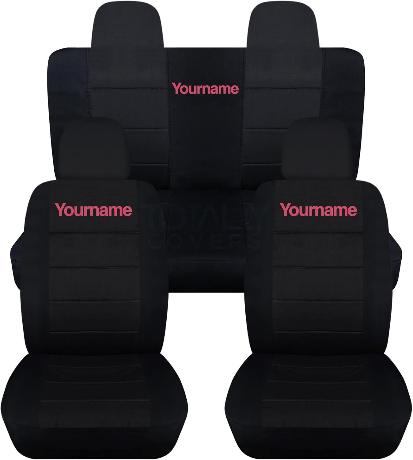 A full set of front and rear, black seat covers with your name/text in teal for a 2010 to 2017 Jeep Compass and Jeep Patriot with a rear bench with split back and bottom. Be sure to visit our storefront ("Totally Covers") where you can find the largest selection of seat covers, to satisfy even the most demanding of tastes. If you can't find what you are looking for, please contact us ("Totally Covers") We can make seat covers for ANY car, truck, van, RV or SUV in a variety of 145 colors and prints, and even add your name/text and logo/design on them!