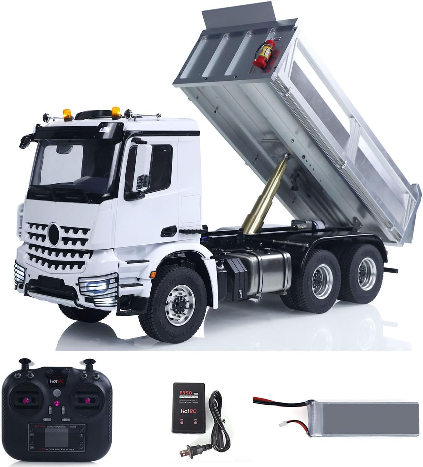 #NOTE: This is a 2025 Type 1/14 6x6 hydraulic dumper, the difference between the 2025 and 2024 types is that the light system, sound system and receiver of the 2025 type have been changed to integrated modules, but the sound and light effects remain unchanged!#Specification:Condition: New, Assembled and Painted.Material: Metal, PlasticScale: 1/14Vehicle Size: About 59*27*15cmGearbox: 2SpeedAxles: Metal, NO Lock DifferentialChassis: 6X6 Metal Chassis#The Package Includes: 1/14 6x6 RC Hydraulic Dump Truck ModelMotorServoESCHydraulic SystemSound & Light & Receiver UnitWarning LightsHotRC 10CH Remote Controller11.1V 3S BatteryCharger#The Package Does Not Include:Hydraulic Oil#Metal Parts:Metal AxlesMetal Wheel HubsMetal BucketMetal GearboxMetal Chassis RailMetal SuspensionMetal BeamMetal Oil TankMetal Exhaust TankMetal Air TankMetal Rear BumperMetal Rack of Water TankMetal Rack of Urea TankMetal Battery Compartment Metal Rear MudguardMetal Drive ShaftMetal Cabin Buckle