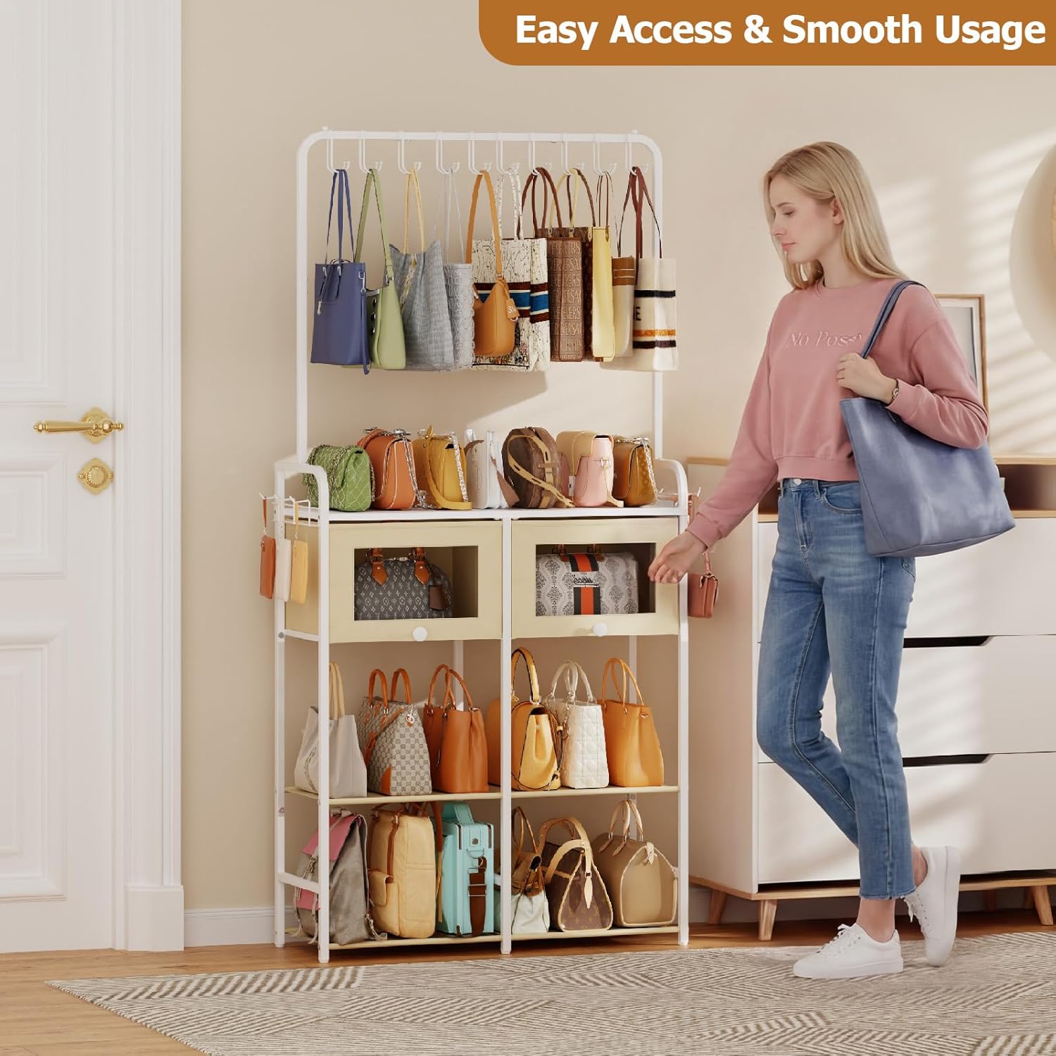 • 【Large Multi-Tier Storage】 Four generous shelves, two deep drawers, and 16 versatile hooks (10 large overhead + 6 side) offer expansive space for purses, bags, and accessories — the large-capacity design keeps your closet tidy, accessible, and beautifully organized, with extra flat top surfaces for additional items.