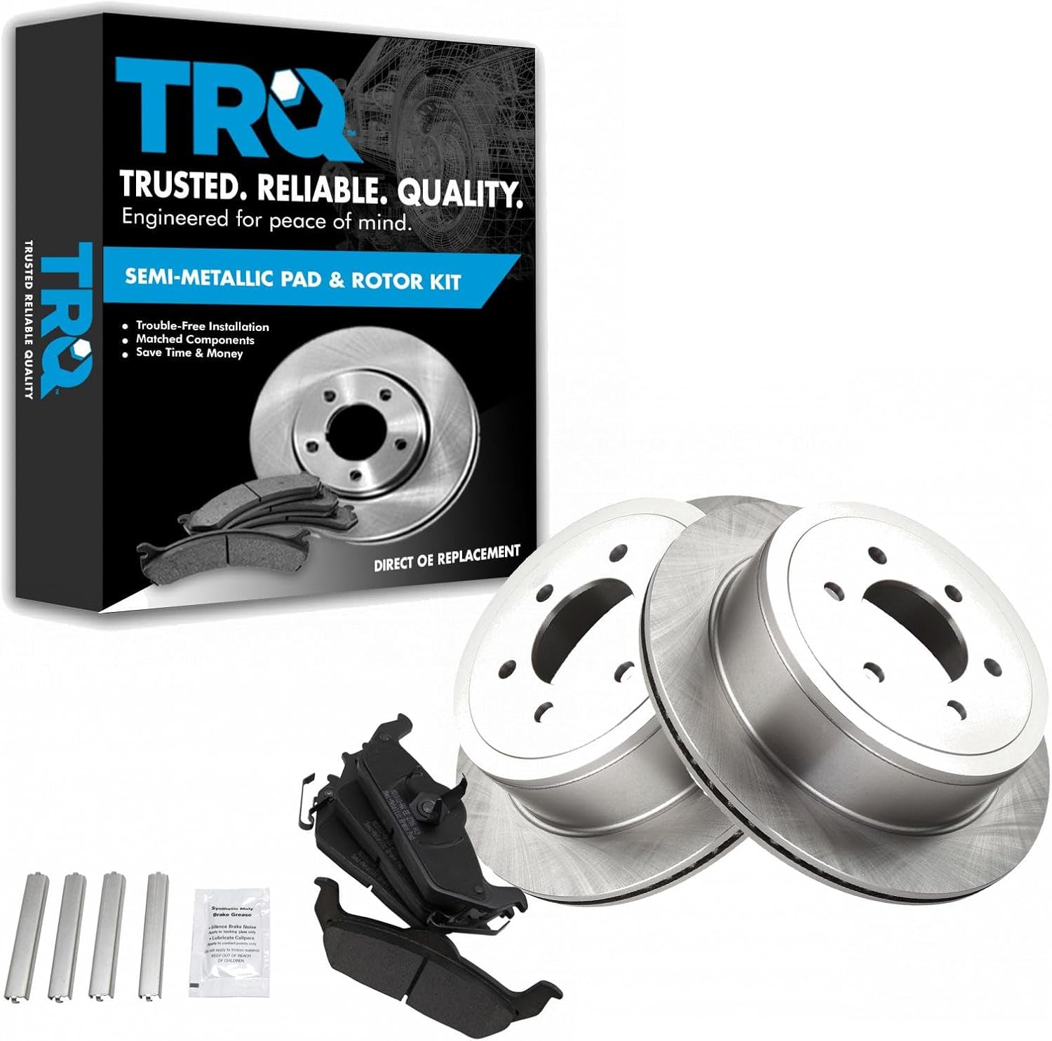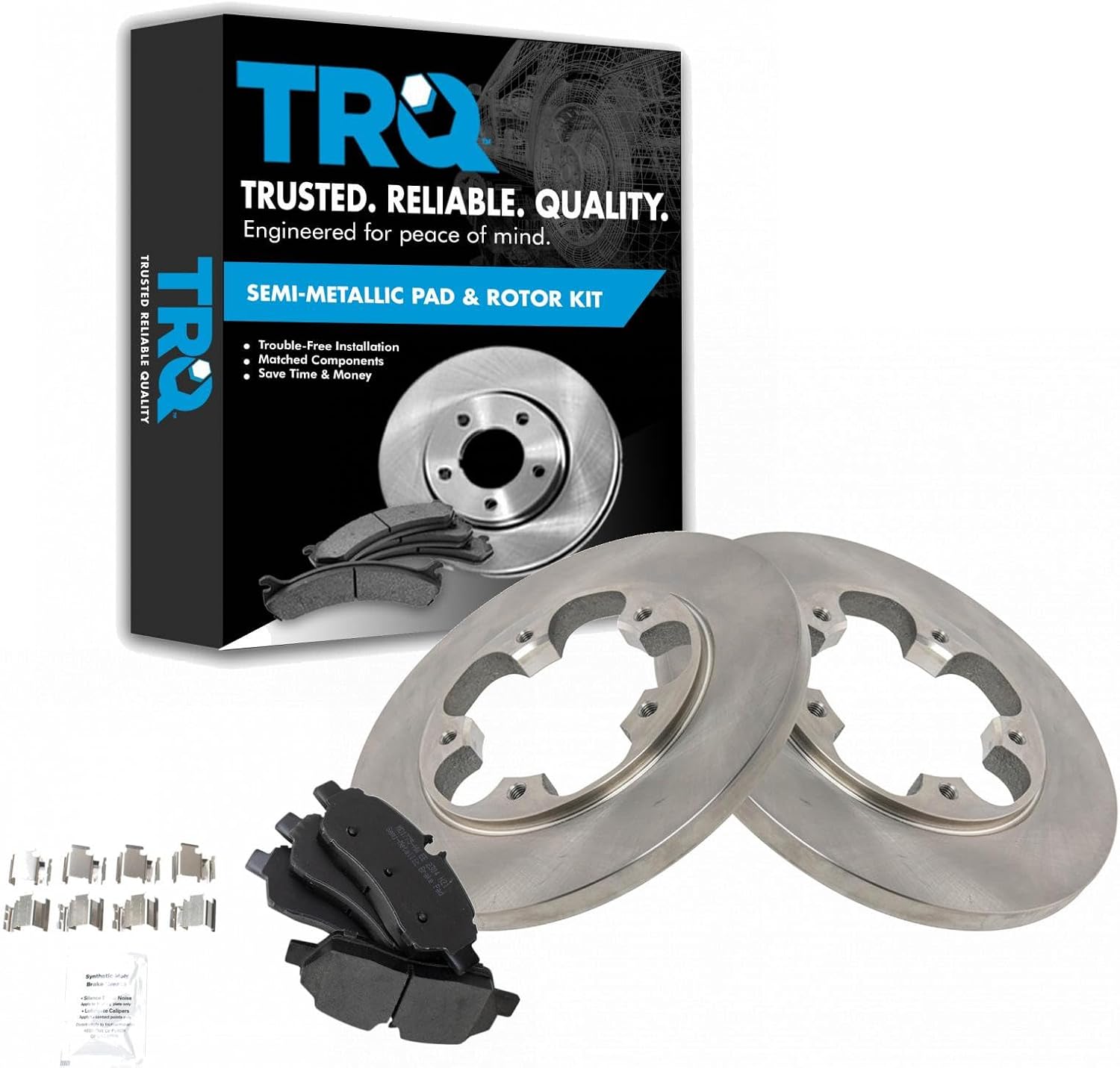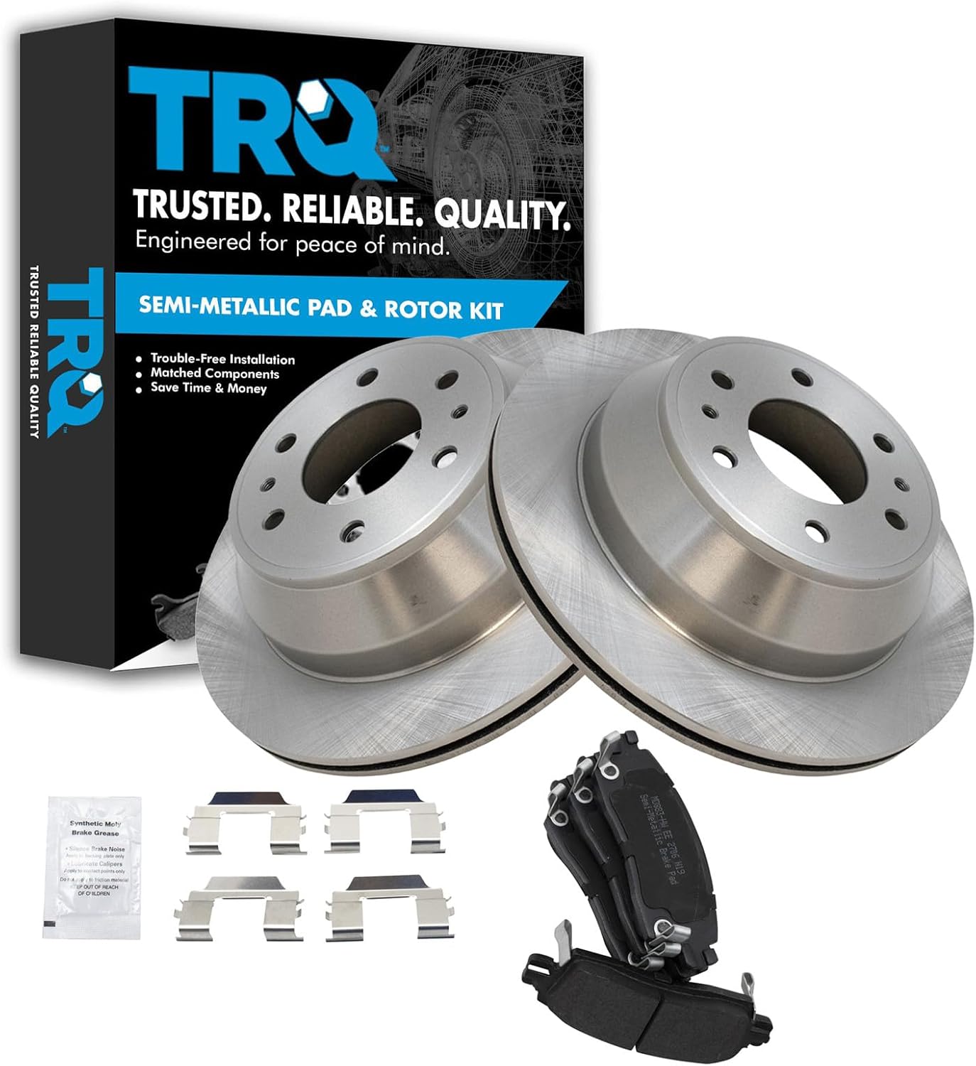 Semi-Metallic Brake Pad & Rotor KitKit Includes(1) Rear Semi-Metallic Brake Pad Set(2) Rear Brake Rotors11.61 in. (295mm) Rear Brake Rotor DiameterFitmentChevrolet Blazer 1997-00 - 4 Wheel Drive Rear 1999-00 - All Wheel Drive Rear 2001 - All Wheel Drive Rear 2001-05 - 4 Wheel Drive Rear 2003-05 - Rear Wheel Drive Rear with 95mm Overall Height Rear RotorsChevrolet S10 Pickup 1998-04 - RearGMC Jimmy 1997-99 - 4 Wheel Drive Rear 2000-01 - 4 Wheel Drive RearGMC S-15 Sonoma 1998-04 - RearIsuzu Hombre 1998-00 - RearOldsmobile Bravada 1997-01 - Olds RearProduct AttributesFriction Material Composition: Semi-metallicRear Brake Rotor Diameter: 11.61 in. (295mm)Wheel Lug Count: 5 LugBrake Pad Bonding Type: Premium PosiBrake Pad Friction Material: Semi-MetallicRear Brake Rotor Venting Type: VentedProduct Features Positive Molded - Less dust resulting in clean wheels G3000 Casting Alloy - Reduced noise and improved wear resistance Application Specific Design - Extended service life, no modificationsItem DetailsTRQ brake kits are designed to restore your brake system to like-new performance. TRQ brake pads are positive molded, thermal scorched, chamfered, and utilize a multi-layer shim for enhanced performance and service life. TRQ rotors have a non-directional finish that reduces the break-in period for new rotors as well as reducing vibrations throughout the rotor’s lifecycle. All products are fit and road-tested in our Massachusetts R&D facility to ensure we deliver on our promise of Trusted Reliable Quality.Reference Numbers18026156533-02373550385670756707FZN56707P56707R8180261560BD125505BR55038EHT729HPRT5180