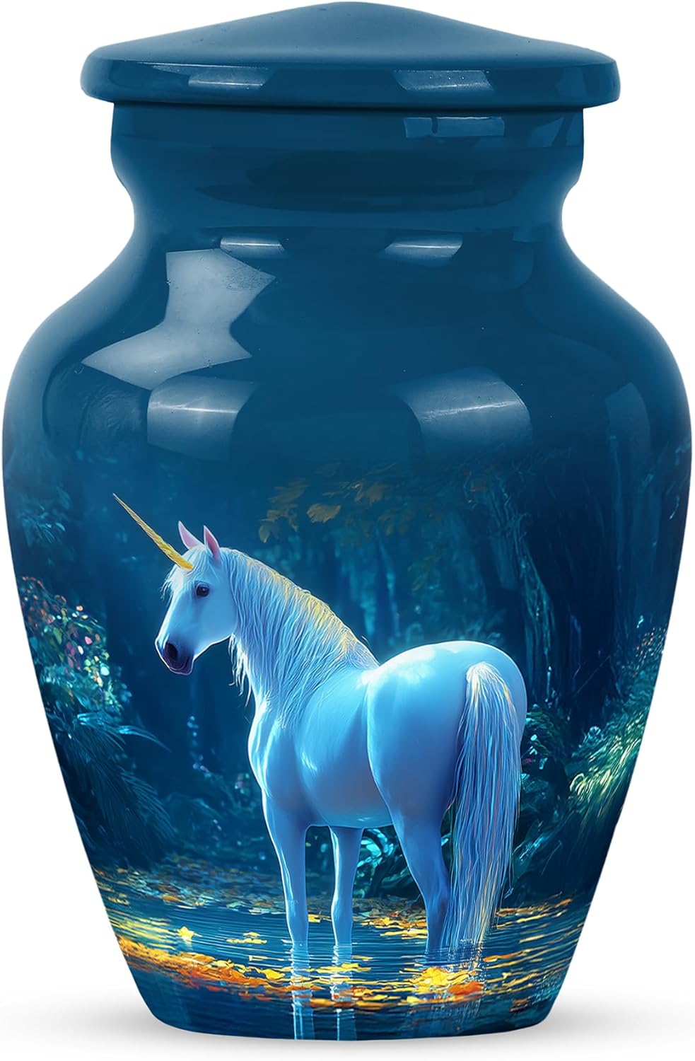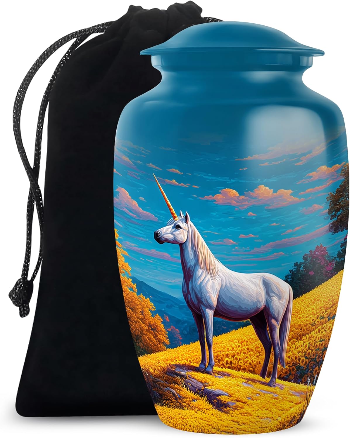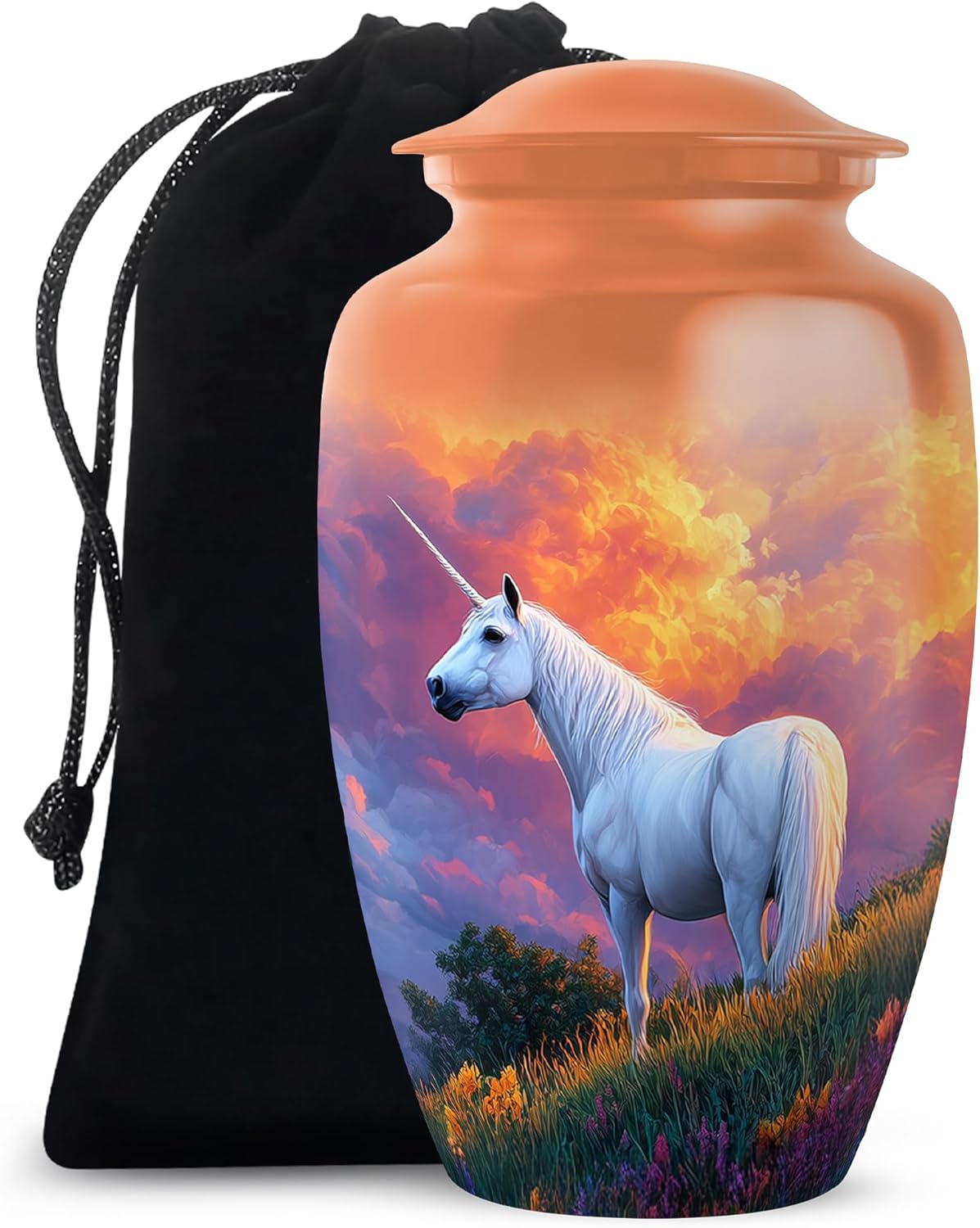 Introducing our large unicorn memorial burial urn, a graceful and enchanting tribute to honor the memory of a loved one who brought magic, kindness, and imagination into the lives of others. Featuring a beautifully detailed unicorn design, this urn symbolizes purity, strength, and everlasting love, making it a unique and heartfelt way to remember someone truly special. This urn stands approximately 10 inches tall and offers a 200 cubic inch capacity, suitable for preserving the full ashes of an average adult. It includes a top-opening threaded lid to ensure the ashes remain securely stored and undisturbed. Crafted with care for both beauty and durability, this urn comes with a soft velvet bag for safekeeping and ease of transport. Its elegant design makes it perfect for display in a memorial space, at home, or in a columbarium. Whether chosen for a memorial service or given as a thoughtful funeral gift, this unicorn-themed urn offers a meaningful way to celebrate a loved one’s vibrant presence and the magical memories they leave behind.