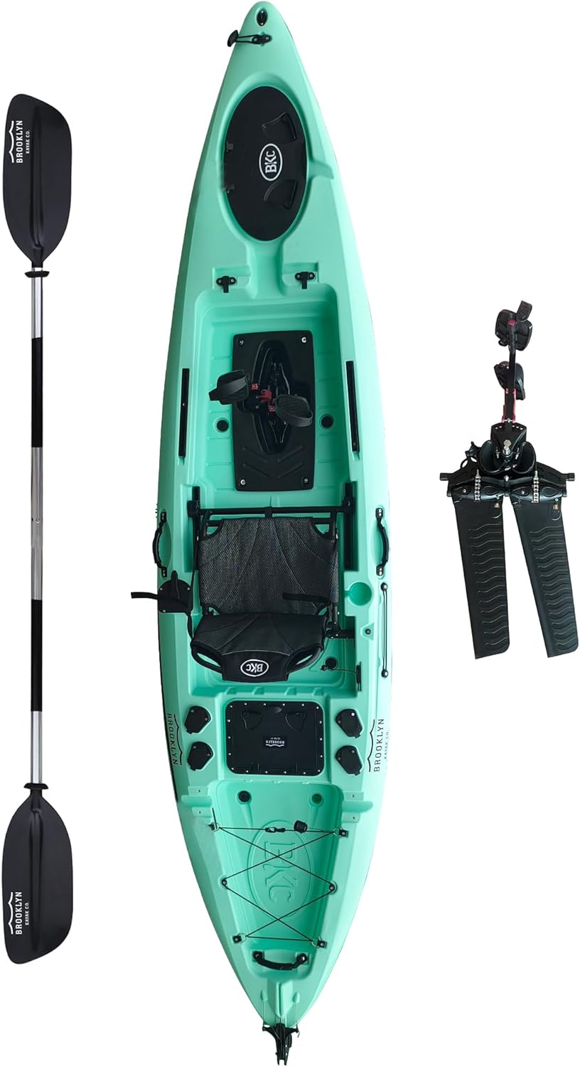 Built for anglers who want speed, control, and endurance, the upgraded Brooklyn 12.0 Pro Single (Propeller) Pedal Kayak delivers efficient performance without sacrificing comfort or stability. The 12-foot sit-on-top hull glides smoothly across flatwater and holds its line through chop or current, giving you confidence whether you’re trolling, casting, or exploring new water. At the heart of this kayak is a hands-free propeller pedal drive system that turns leg power into effortless forward motion. The bicycle-style pedals feature adjustable foot straps for a secure, natural feel, and the entire drive removes easily if you prefer traditional paddling or want to upgrade with a trolling motor. A hand-controlled rudder provides precise steering, letting you track straight in wind or pivot quickly when lining up a cast. Storage is built for real fishing days, not just short trips. Dual watertight hatches with dry bag inserts protect valuables, while the spacious rear cargo area with bungee tie-downs handles tackle crates, coolers, or overnight gear. Scupper holes with plugs and added nose drainage help shed water fast, keeping cleanup simple after long sessions. Despite its full-size performance, the 12.0 Pro weighs just 70 lbs and includes molded bow, stern, and side handles for easy transport. Finished with a supportive aluminum-frame seat and flush-mounted rod holders, this pedal kayak is ready for serious time on the water—whether you’re chasing fish, covering distance, or doing both in one trip. Designed and sold factory-direct by Brooklyn Kayak Company, the 12.0 Pro Single delivers premium features and upgrade flexibility without the premium price.