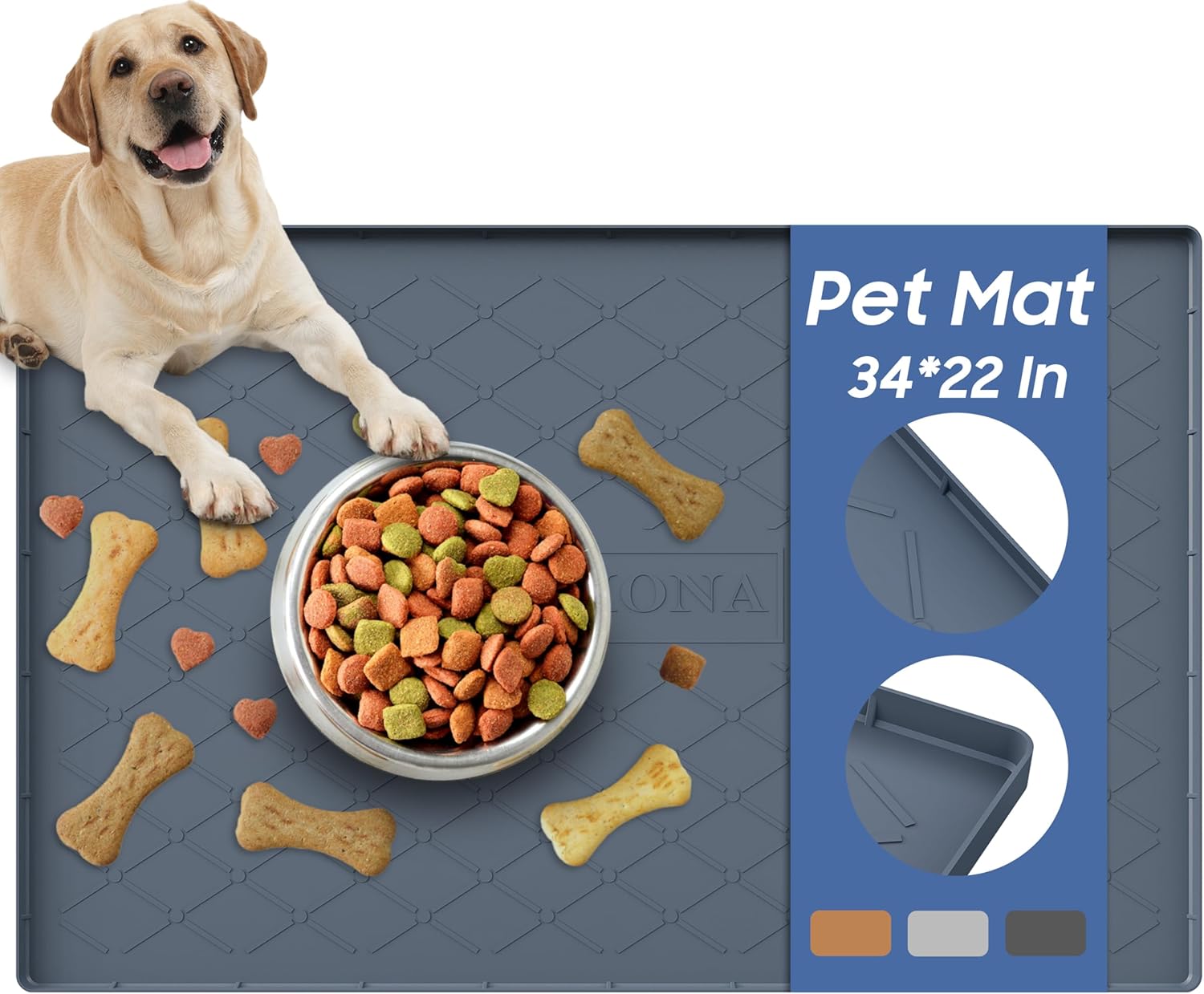 Reusable pet food silicone mats for large dogs, large cats in three large sizes. Helps pets eat cleanly, protects floors and blankets, quick and easy to clean.