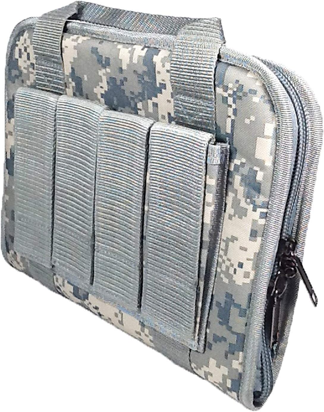 PRODUCT DETAILS Dimensions and weight: External: 12”(Length) x 9”(Height) x 1.5”(Depth) Internal: 11"(Length) x 8"(Height) 12 oz empty (Approximated weight) Compartments and Pockets: 1 lockable main compartment with foam pad inside (Padlock NOT included) 4 magazine pouches with Hook-and-Loop Velcro flap 1 extra pockets on the back with Hook-and-Loop velcro flap Materials: Polyester with PVC water resistant lining Heavy duty zippers Accessories and additional features: Lay flat design for instant access to pistol compartment Wrap-around zipper Lockable Zippers (Padlock not included) Reinforced grab-and-go handles Other colors are available and please check its availability * Note: Gun cases are designed primarily for transportation and not for long term storage. Long term storage of a firearm in any case may result in corrosion and damage to the firearm finish.