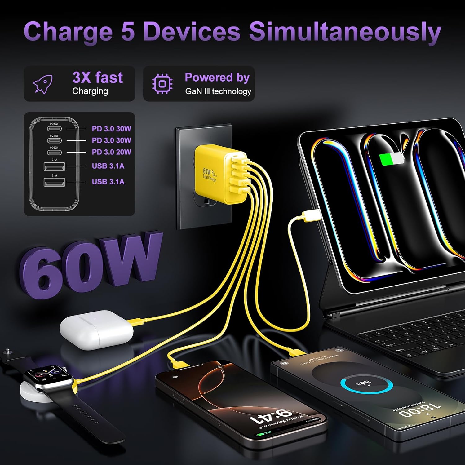 | BuiltIn Media | 2 x 60W 5 Ports USB C Fast Charger Block,18-month guarantee |