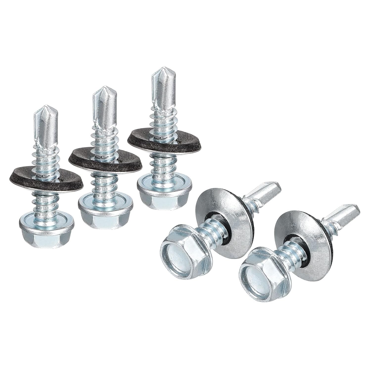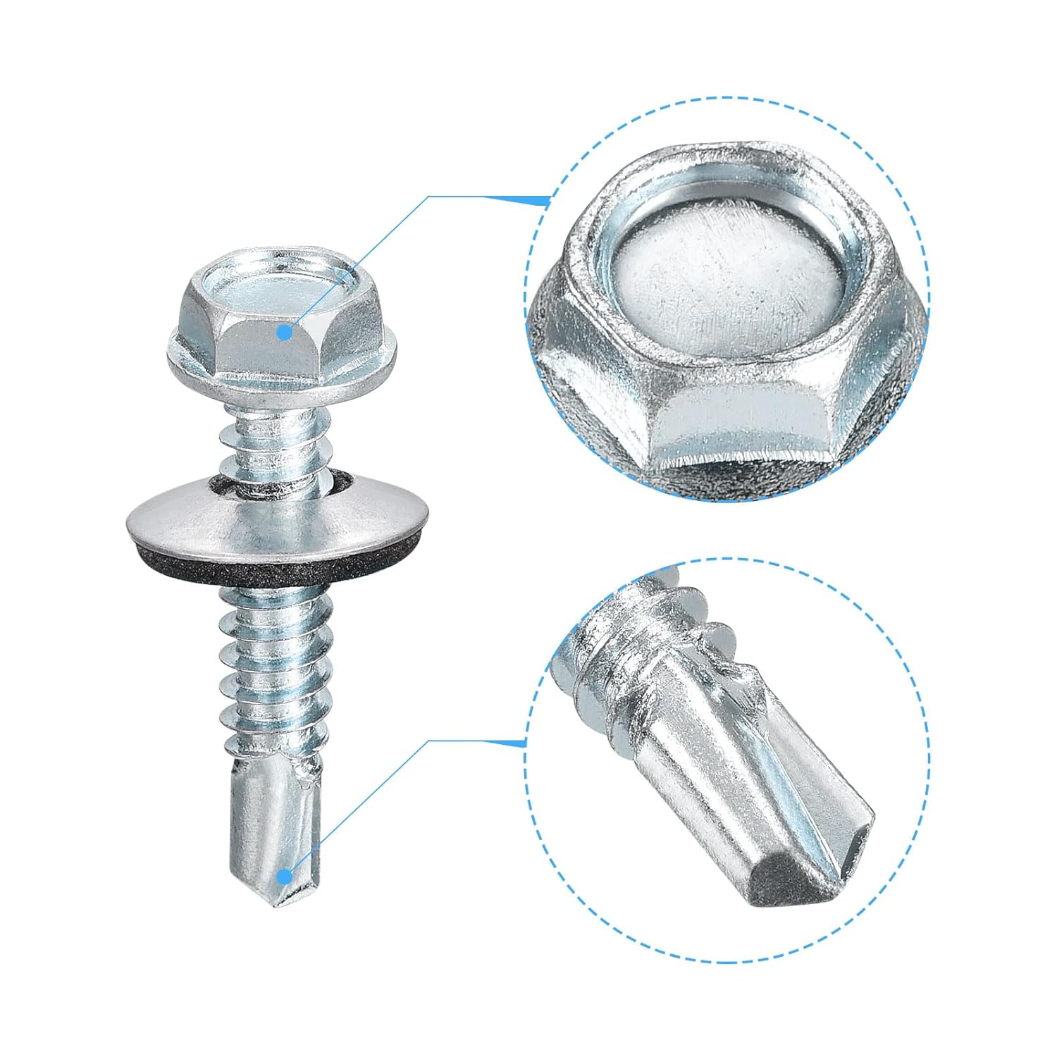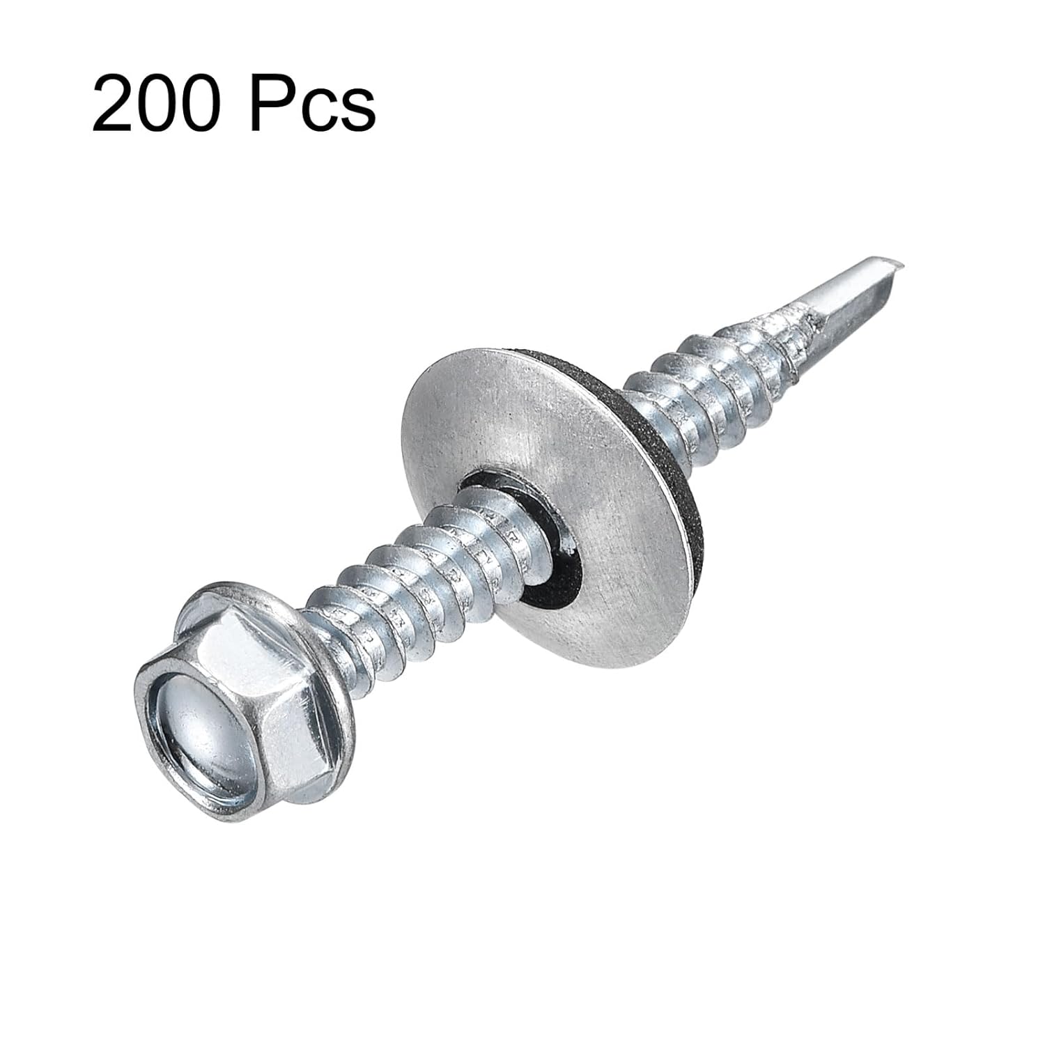 Description:1. Material: Both the screws and metal washers are made of carbon steel, the surface of the screws is galvanized, with fine workmanship, strong and durable, corrosion-resistant, and not easy to rust; the washers are made of EPDM, which is wear-resistant, anti-oxidation, and has a long service life.2. Design: The head of these self-drilling screws has a tip that can cut the material when rotating, and can be easily driven into the substrate, providing better torque transmission and more stable performance. The force is evenly distributed and not easy to slip, suitable for replacing old screws at any time. The hexagonal washer head has a flange and an EPDM rubber gasket at the bottom to prevent leakage, loosening and damage to the mating surface.3. Easy To Use: Simple operation, convenient and quick installation. Hexagonal head, easy to drive, able to drill holes by itself during installation, no pre-drilling is required, you only need to use a power drive tool to install it.3. Wide Application: The hex head self-tapping screws are commonly used for metal-to wood, and metal-to-metal, they are suitable for thin metal, roofing, steel nails, DIY furniture appliance repairs, electronic products, etc.Specification:Material: Carbon SteelColor: Silver ToneThread Dia.: #14 (6.3mm) Length(not include hex head): 1-1/2"(38mm)Thread Pitch: 1.8mmHex Head Size: 10x5.9mm / 0.39" x 0.23"(WxT)Flange Dia.: 12mm / 0.47"Washer Size: 16 x 3.5mm / 0.63" x 0.14"(D*T)Package Content: 200Pcs x Self Drilling Screws