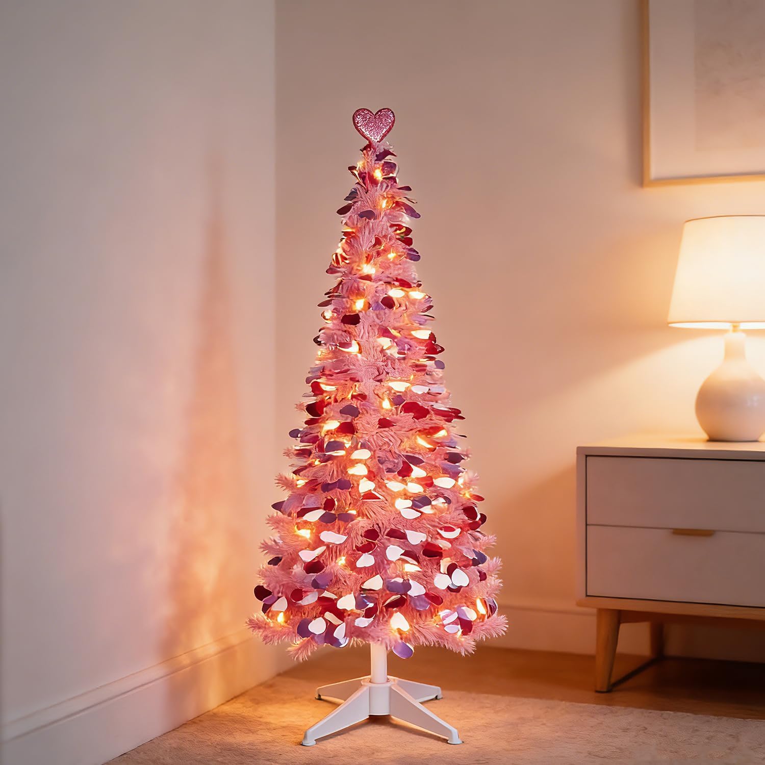 Specification: Product name: Valentines Day Christmas Tree Material: plastic Color: red, peach, purple Item size: specific size as picture shown Powered by 3 AA batteries (not included)Package includes:1 x Christmas Tree