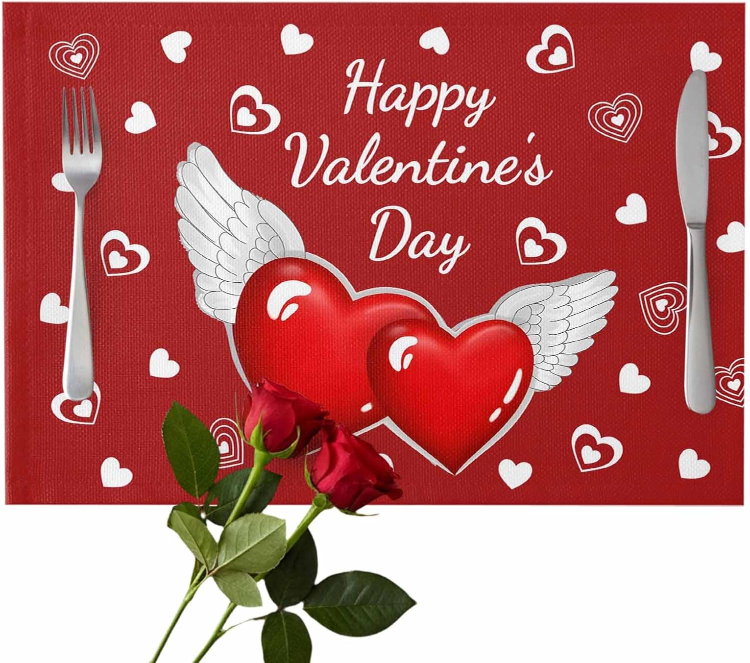 Valentine Placemats Set for Valentine's Day Holiday Dining Table DecorđSpecificationMaterial: Mixed Polyester Cotton Linen-high quality durable materialSize:Table placemats set of 4 & Table placemats set of 6 13x19 InchđExcellent QualityMade of high quality polyester, soft, wrinkle-proof and heat resistantăPerfect to protect the tabletop from food stains, and scratches.đExquisite workmanshipExquisite Pattern & detail, full of romantic atmosphere.đBright Table DecorGreet your guests with delicious foods and warm tabletop decor.Add flair to your dining table with our unique design placemats.đVarious OccasionThese Valentine's day placemats are perfect for home kitchen dining room table centerpieces and seasonal decorations. And also suit for the living room, bedroom, shabby chic, farmhouse, rustic, barn, woodland, vint table. Good for everyday use, garden, parties, anniversary, wedding, holidays etc.đAdd a Valentines atmosphere to your home!Love heart placemats combine chic colors, making this setting elegant and high-quality. Easy to match your holiday table decoration, add a romantic atmosphere to your home.đWarm Notice1. Do not bleach, machine washed; Tumble or line dry; light iron.2. Due to monitor differences, the actual color may vary slightly from what appears on your monitor's display.