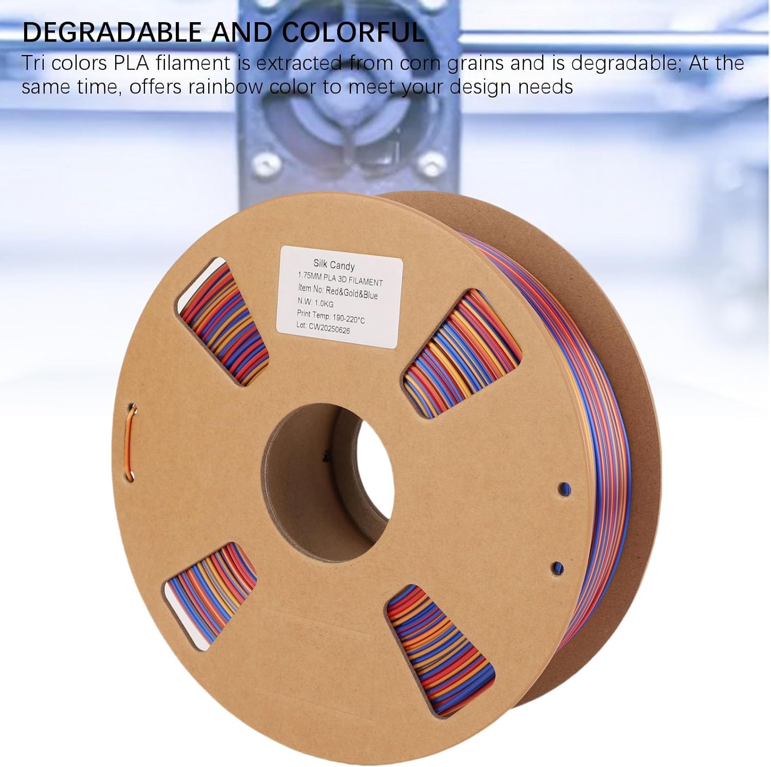 Spec: Item Type: Colors PLA Filament Material: PLA Color: Red, gold, blue Size: Approx. 1.75mm / 0.07in Net Weight: Approx. 1KG / 2.2lbs per roll Printing Temperature: 190-220℃ Support Printing Speed: 40-100mm/s How to Use: Directly use packing list: 1 Roll of Colors PLA Filament