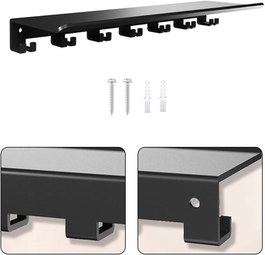 Features:*Versatile Storage: This wall-mounted organizer is designed to hold a wide range of gym equipment, including resistance bands, jump ropes, and weight belts, Guaranteeing that all your fitness essentials are neatly stored and easily accessible.*Sturdy Construction: Crafted from 3mm thick metal with a robust coated finish coat finish, this storage rack is built to endure the rigors of daily workouts, providing a reliable solution for your valuable fitness gear without compromising on durability.*Space Efficiency: Its compact design optimizes your workout area by utilizing vertical space effectively. The rack helping you maintain an organized environment while maximizing floor space.*Organizational Features: Equipped with multiple hooks and compartments, this rack allows for efficient organization of various fitness accessories. Keep everything from foam rollers to chains in dedicated spots, saving you time during workouts and enhancing your training experience.*Heavy-Duty Capacity: Each hook can support up to 40 pounds, making this rack suitable for storing heavier items like barbells and chains. Its versatile design caters to all fitness levels, Assuring that everyone from beginners to seasoned athletes can keep their workout space tidy.Specifications:*Product Name:Floating Shelf Organizer*Material:Metal*Size:As shown*Color:blackPackage Content:Floating Shelf Organizer×1