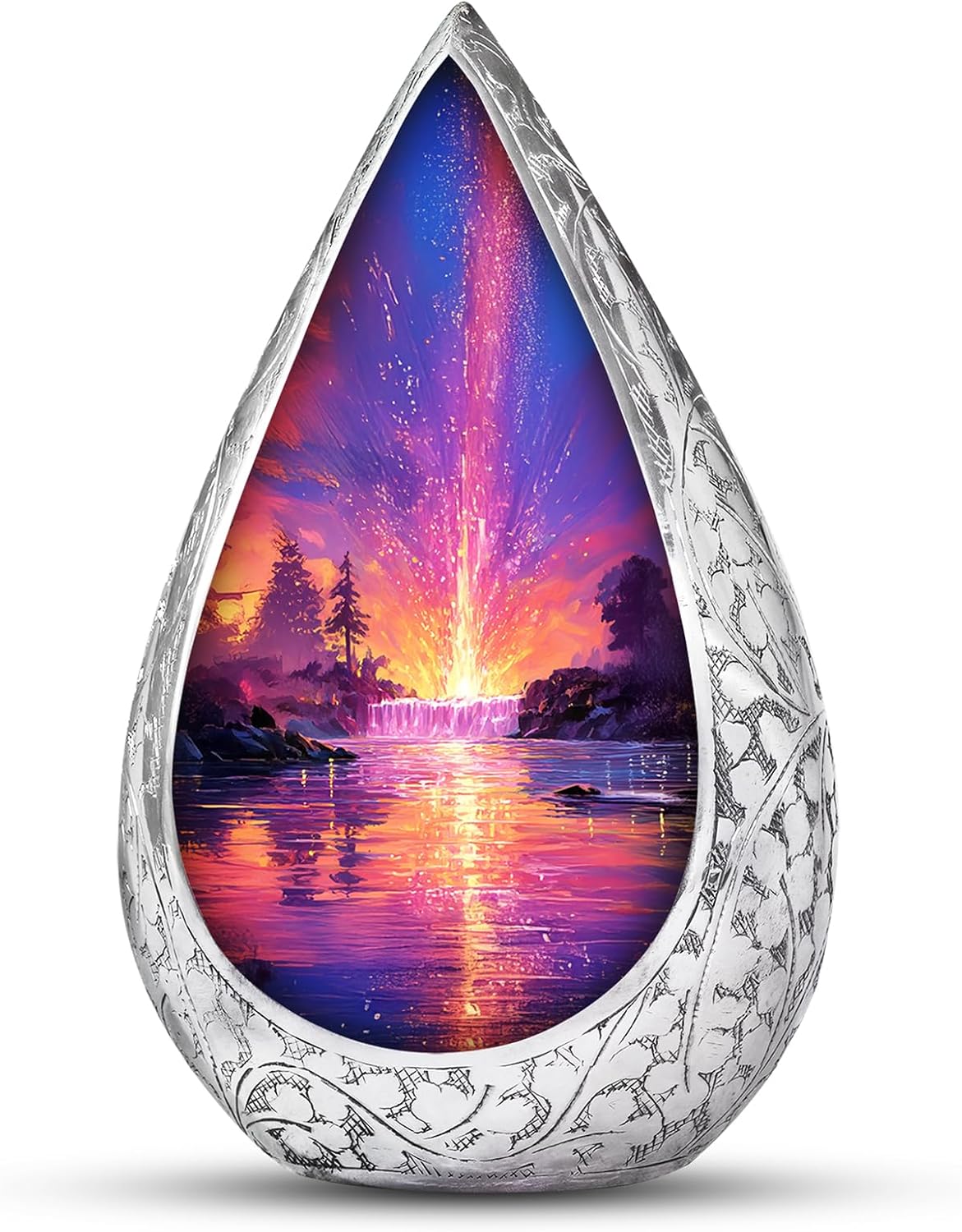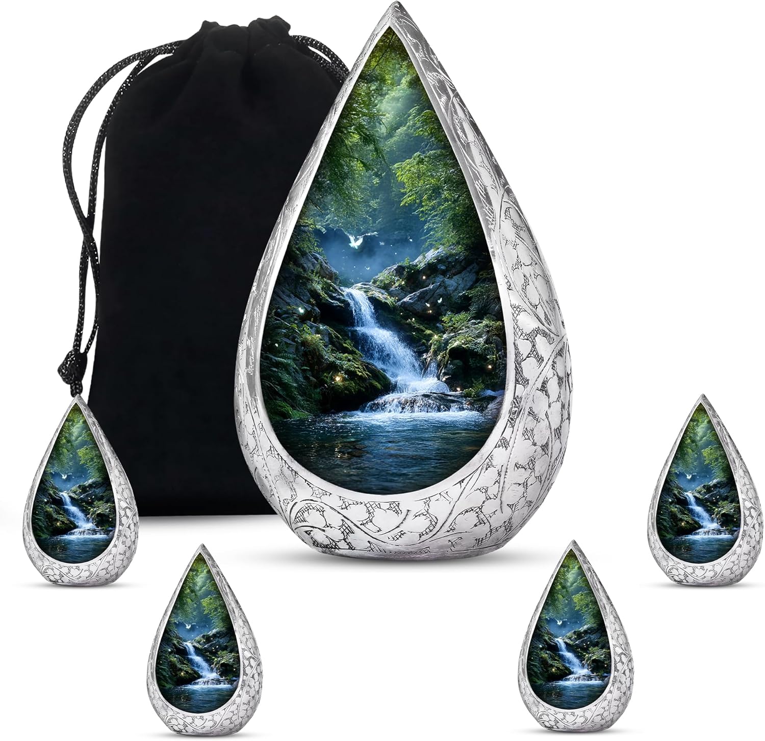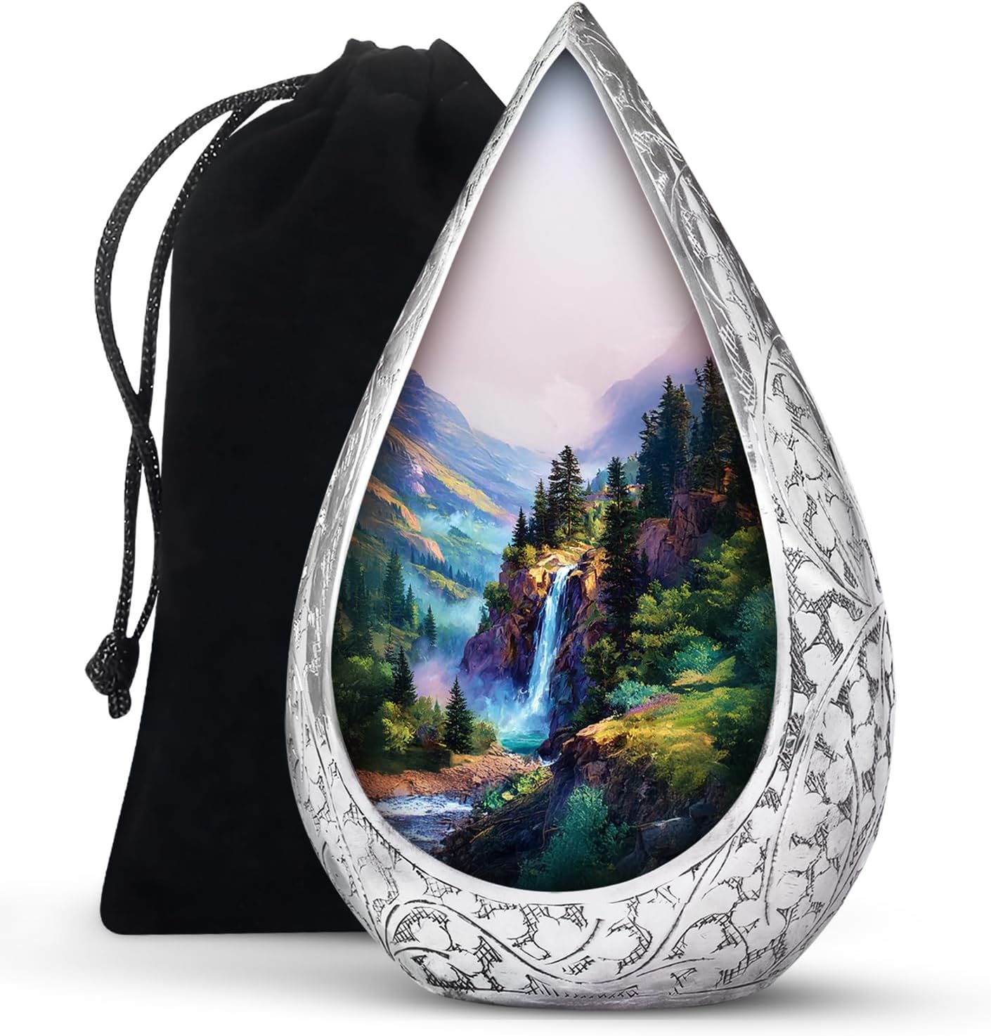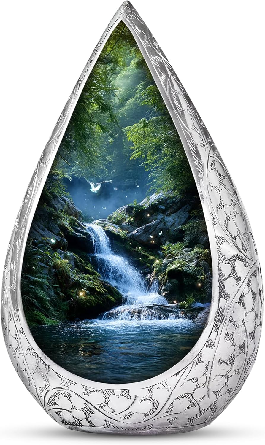 Introducing this waterfall themed 10 inch decorative urns holds up to 200 cubic inches of ashes, making it ideal for preserving the full cremated remains of an adult along with meaningful keepsakes like dried flowers, notes, or small tokens. Its height allows for a well-balanced and unique design, for adult ashes women is ideal for placement in a house, memorial or pet site for adult ashes. Despite its unique and beautiful shape, our decorative urn for ashes adult maintains a compact and beautiful appearance for years, which makes Introducing this urns for human ashes suitable for a mental, shelf, or monument. Our pet urns for human ashes men and women is equipped with our threaded screw-on lids for adult women, ensuring that the ash is safely attached. Introducing this cautious lid prevents accidental spreads or leaks, providing comfort to those who want to keep the remains of their loved ones near. The surface of our urn for mother is polished for perfection, with a coating that is a guard against scratches, fingers and environmental damage, preserves its amazing appearance for the coming years. With its strong craftsmanship, artistic details, Introducing this ashes urns with beautiful shape. It is an ideal choice, representing, transformation comfort, strength, love and consolation, who are looking for a dignified way to honor and preserve the memory of your loved one in respectful manner.