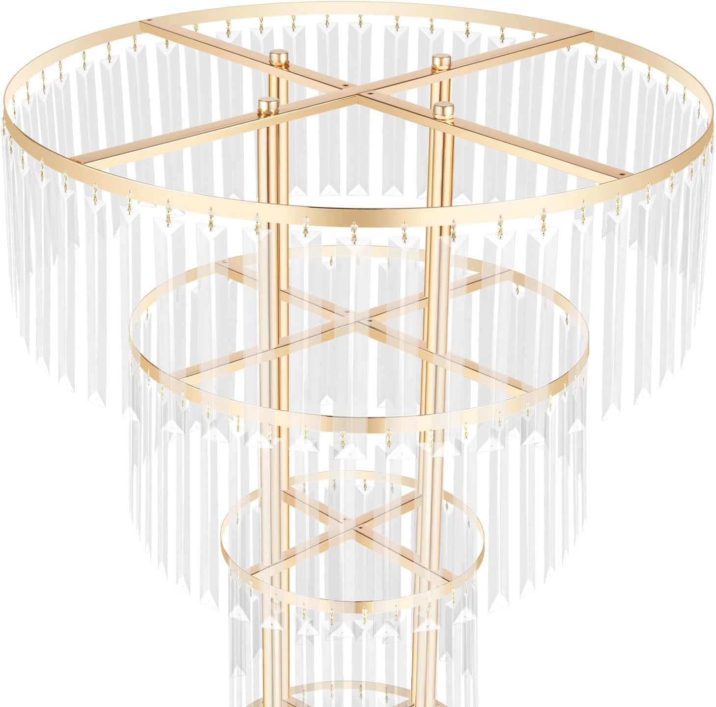 DescriptionA successful wedding ceremony cannot be without beautiful flowers. This crystal flower stand set uses high-quality material and has a stable structure, allowing your flowers to be placed steadily and neatly. Its simple structure and smooth surface allow for easy installation and cleaning. You can decorate it with various items to make your indoor/outdoor wedding more romantic.Key FeaturesSturdy and Durable: They are made of high-quality iron and acrylic with an electroplated process, which is sturdy and not easily deformed, ensuring a long service life.Great Decoration: Designed with a modern and simple concept, its beautiful round shapes and crystal appearance create a romantic feel for your bouquet and make parties and special occasions glamorous and romantic, enhancing the class and style of your space. You can put flowers, balloons, tulles, vines, etc. on the top of the product or wrap them around the product, making it an exquisite decoration for the party and witness your wonderful memories.Thoughtful Design: The 3-tier design not only looks beautiful and airy, but also has a height of 35.43 inches, which makes it easy for you to embellish it with flowers, balloons, etc. without having to bend over!Strong Load Capacity: Thanks to its high-quality material, crossbars and sturdy round shape, it can hold up to 17.64 lbs, allowing you to place flowers, balloons and more with confidence.Easy to Clean: Thanks to its smooth surface, detachable design and simple construction, you can easily clean them with water and a soft cloth.Assembly in A Breeze: With a simple structure, and complete accessories, you can put them together quickly and enjoy the assembly process.Ideal Gift: Thanks to its beauty and practicality, you can give it to your friends or colleagues as a wedding, Christmas, or Thanksgiving gift.Protective Package: We have used air bubble bags to wrap this product, designed to minimize damage to the product during shipping.DetailsRounded Edges: They not only enhance the aesthetics of the product but also improve safety during installation and use.Round Base: The 11.02 inches diameter round base ensures stability when the product is standing up.ApplicationIt is suitable for weddings, birthday parties, Christmas parties, happy Valentine’s Day decorations, banquets, anniversary celebrations, school opening ceremonies, graduation party decorations, candy buffets, dessert tables, bachelor parties, photo booth background decorations, store openings, baby showers, graduation parties, and other special events that you want to decorate.SpecificationsMaterial: Iron and AcrylicProcess: ElectroplatedColor: GoldStyle: ModernShape: RoundMount Type: FreestandingAssembly Required: YesNumber of Tiers: 3Load-bearing Capacity: About 8kg/17.64lbsProduct Size(D*H): 50*90cm/19.69*35.43 inPackage Size: 53*53*15cm/20.87*20.87*5.91inBase Diameter: 28cm/11.02inGross Weight: 5kg/11.02lbsNet Weight: 3.5kg/7.72lbsPackage Included1* Crystal Flower StandOther Accessories for Use
