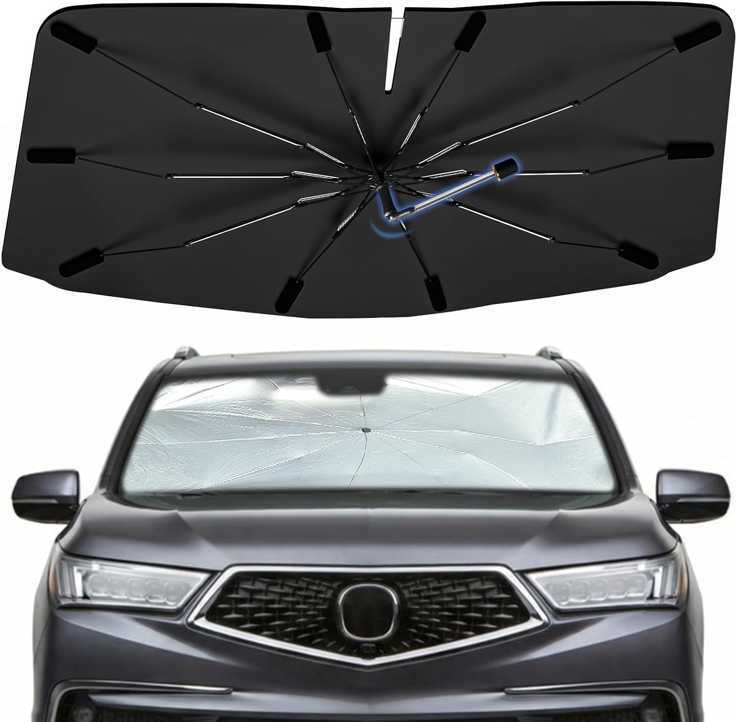 • 360° Adjustable Handle & Scratch-Free Design: The Bocvam windshield sun shield has flexible handle rotating freely to adapt to any windshield angle, avoiding scratching dashboard or screen, delivering a safe and a sleek interior shield