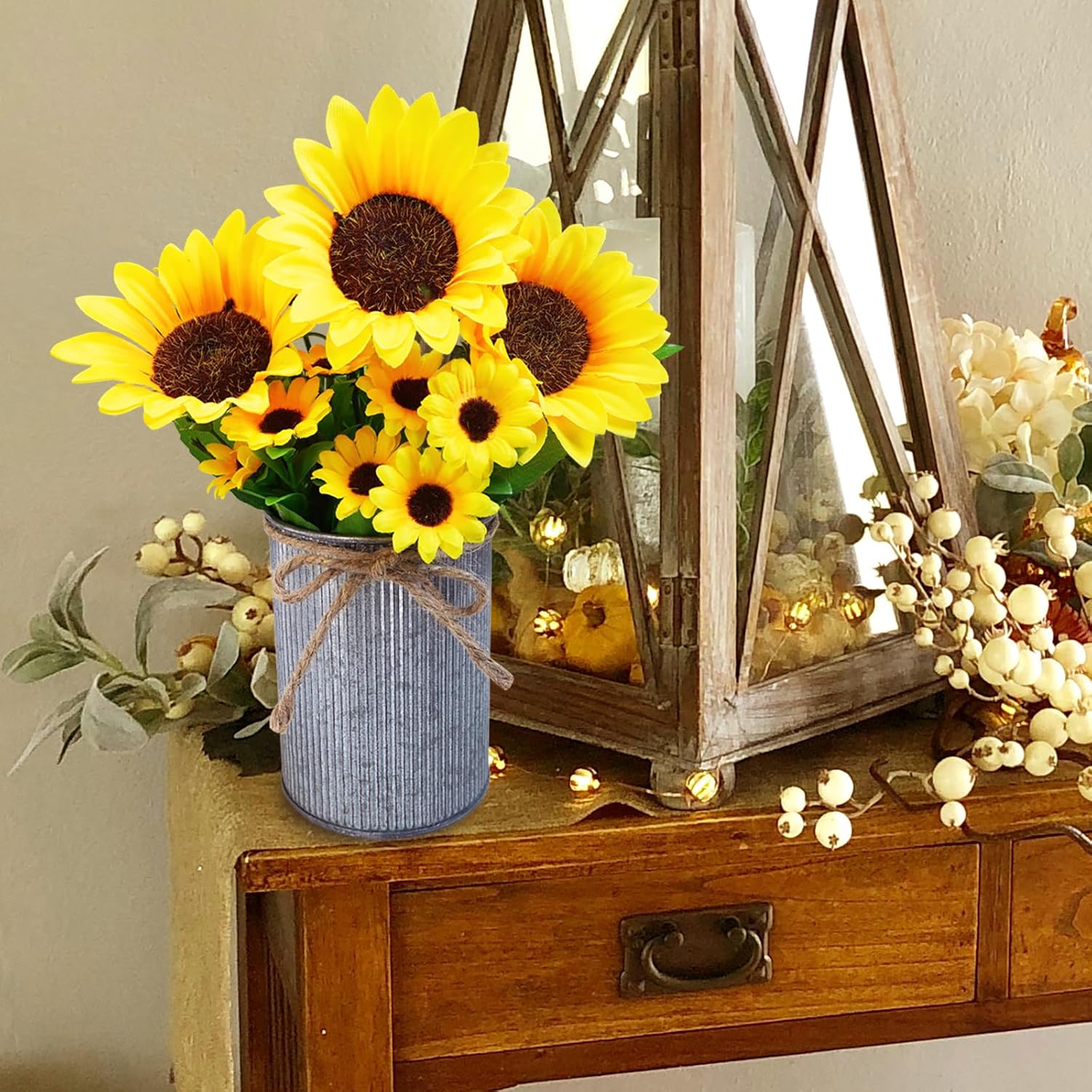 Complete and Enchanting Centerpiece Set: - Includes: 3 Artificial Sunflower Bouquets, 3 Galvanized Metal Pots with jute twine, and 1 Rustic Rectangle Wooden Tray.- Versatile Use: Each item in this set is designed to stand alone, allowing you to create a variety of decorative combinations to keep your space fresh and inviting.- Compact Size: The metal pots and wooden tray are just the right size to be independently placed in various spaces, making them suitable for different surfaces and corners.Delightful Table Centerpiece Trio: Versatile Elegance for Many Occasions:- Dining Table: This sunflower centerpiece for the dining room or table adds a natural and rustic atmosphere to the dining experience.- Mantel Shelf: Transform your living room by adding this cozy centerpiece to the mantel for a personalized touch.- Entryway: Make a lasting impression on guests by displaying this centerpiece in your foyer or hallway, reflecting your refined taste.- Rustic Weddings: Enhance the reception or banquet tables with this centerpiece for a countryside-themed wedding, fostering a serene and natural ambiance.- Special Events & Holidays: It can be used for baby shower, bridal shower, spring, summer, and fall holidays such as Mother's Day, Thanksgiving, etc.- Gift-Giving: Serve as a thoughtful housewarming, hostess, or special occasion gift for birthdays, graduations, retirements, Mother's Day, Teacher's Day, Valentine's Day, and holidays, conveying your heartfelt sentiments.