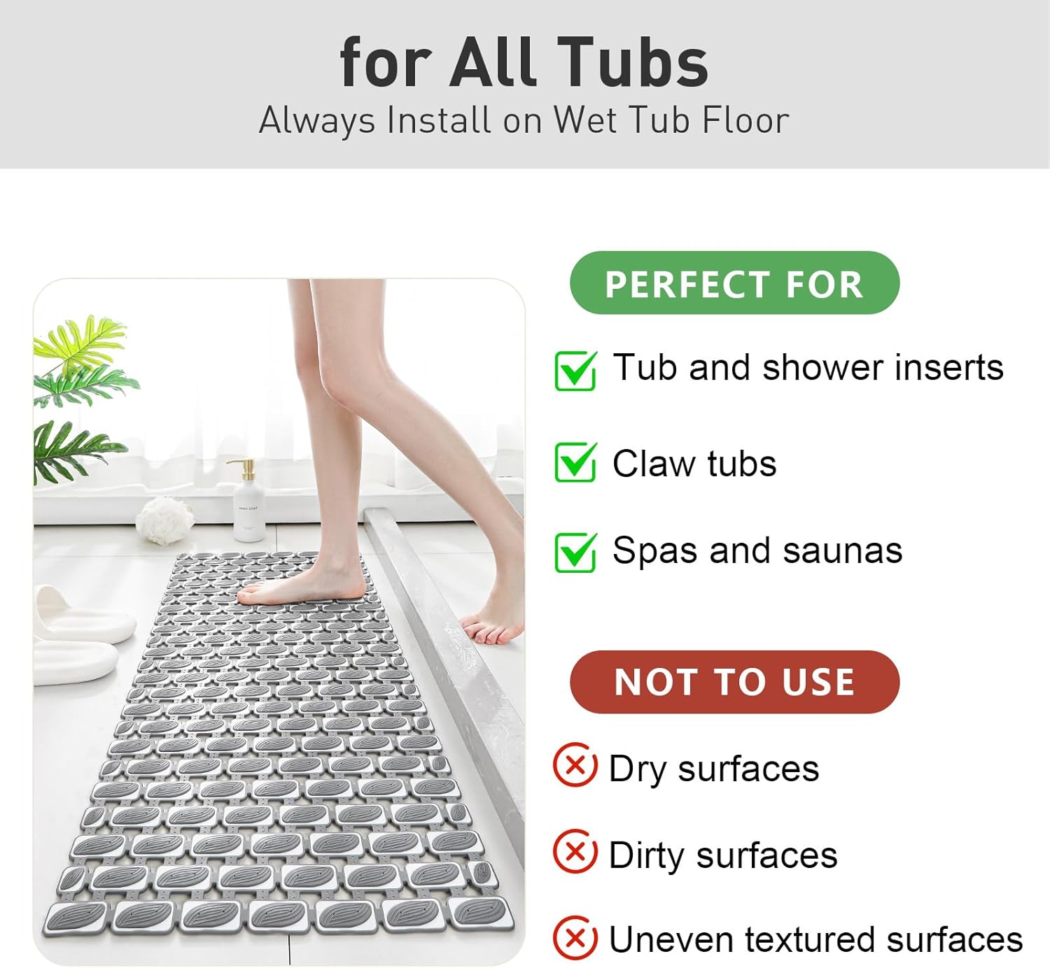 【✅ Quick-Draining & Hygienic Design】Our bath mats for tub is designed with 273 drainage holes and features a 3mm gap from the ground. Nonslip bathtub mat features an open grid pattern to promote fast water drainage, preventing puddles for a cleaner, healthier surface